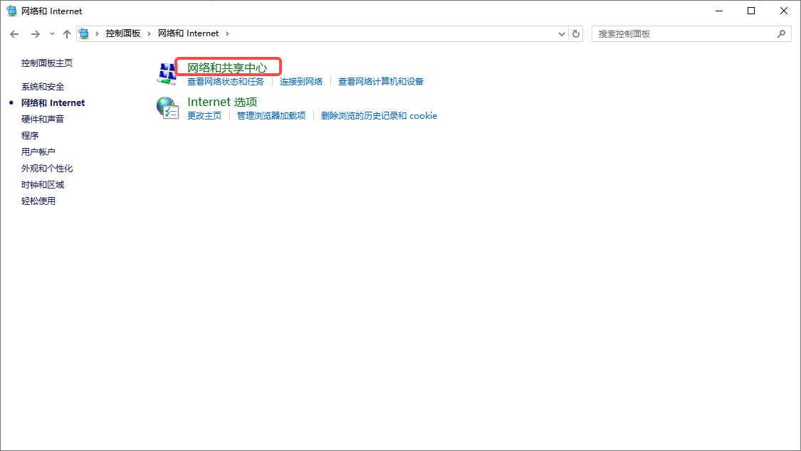 Windows桌面左下角搜索“控制面板”,打开控制面板后,点击“网络和 Internet” -> “网络和共享中心” -> “更改适配器设置”