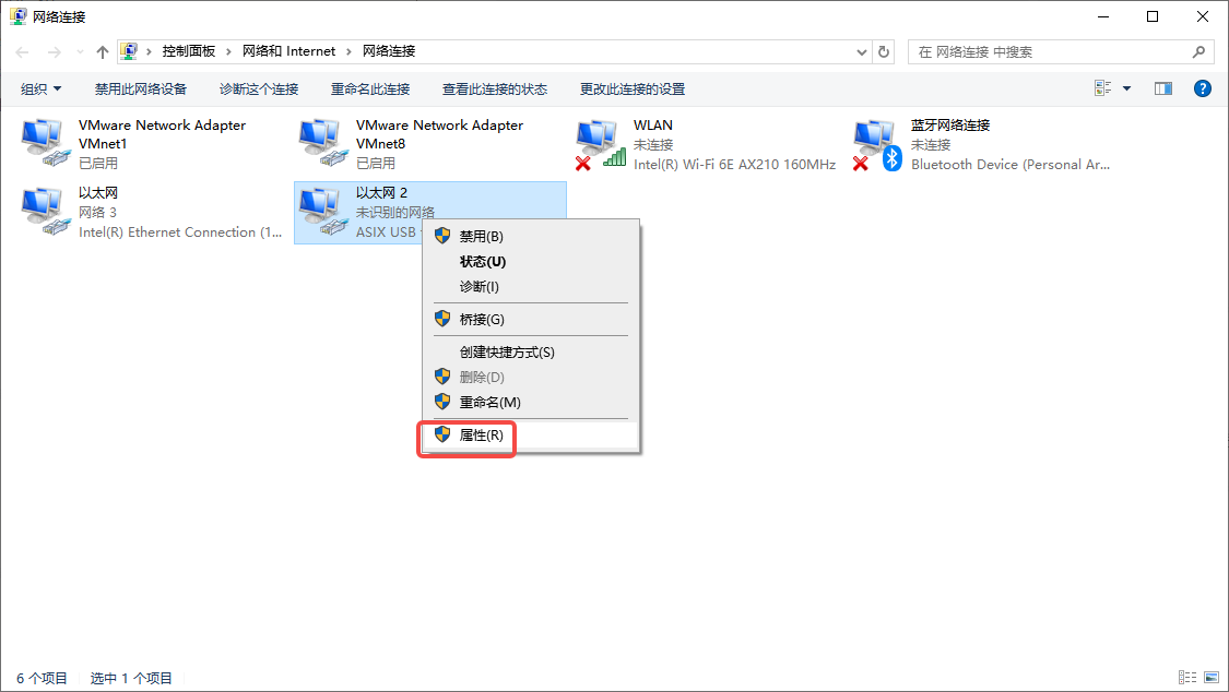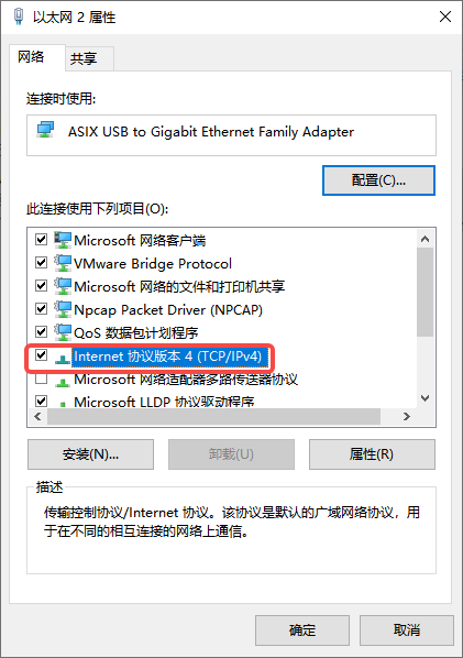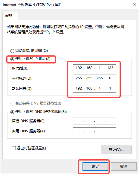 右键此网口,点击“属性”,双击“Internet协议版本4(TCP/IPv4)”,选择“使用下面的IP地址”,输入和工智机相同网段的IP地址、子网掩码、默认网关等,设置完毕后点击“确定”。页面回退到上一级,再次点击“确定”,IP地址设置成功。