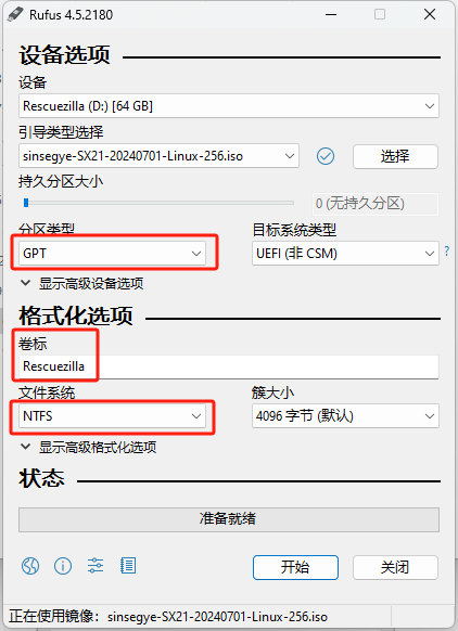 根据红框所示进行参数配置,点击开始。配置好的安装选项如下图:卷标输入:Rescuezilla