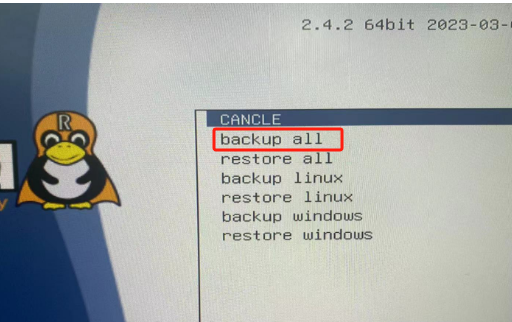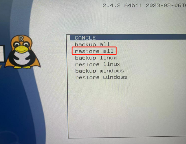 选择需要刷写的系统 从U盘进入系统后,可见下述画面。根据自行需要进行系统刷写: "restore all": 重新刷写整个系统 "restore linux": 单独刷写底层linux系统,不影响上层windows系统。 "restore windows":单独刷写windows系统,不影响linux系统