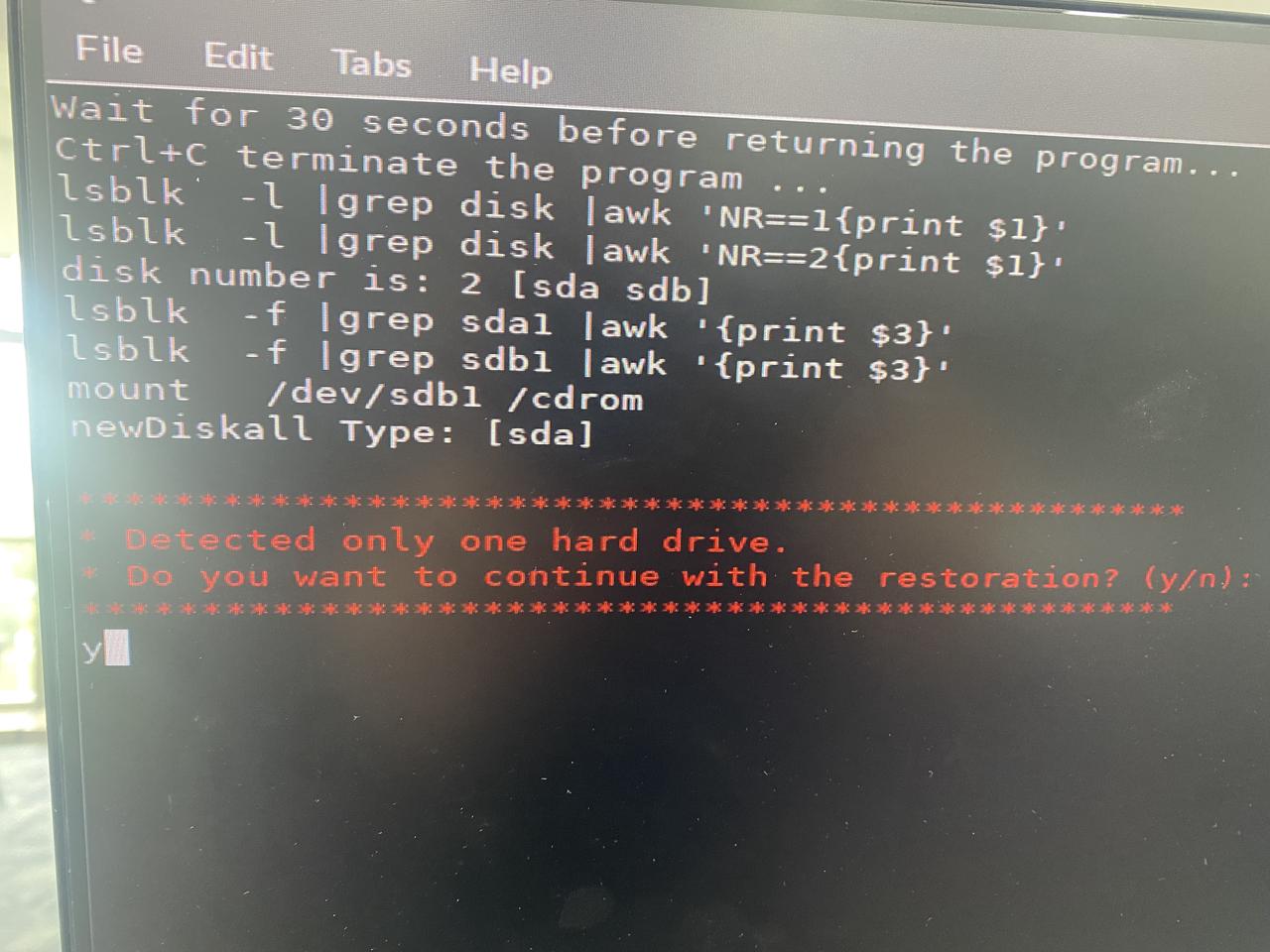 注:还原过程遇到此现象 说明只检测到一个硬盘,输入y ,输入"enter"确认后可继续下一步