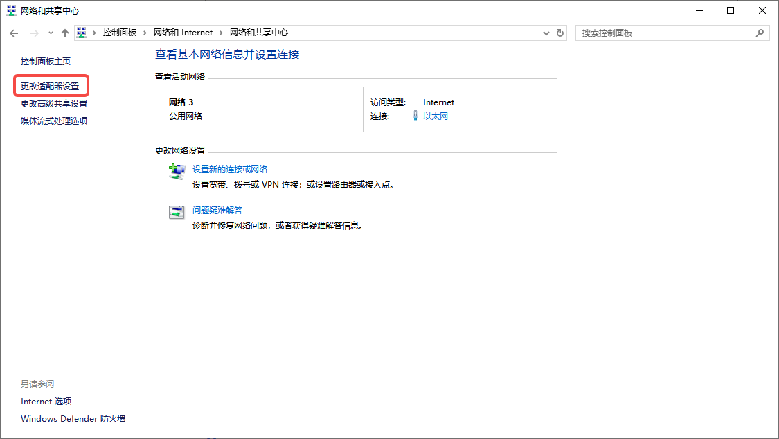 机器断电重启,可在工智机Windows桌面左下角搜索“控制面板”,打开控制面板后,点击“网络和 Internet” -> “网络和共享中心” -> “更改适配器设置”,在弹出的界面中查看是否少了一个网卡,少一个网口,则证明网口删除成功