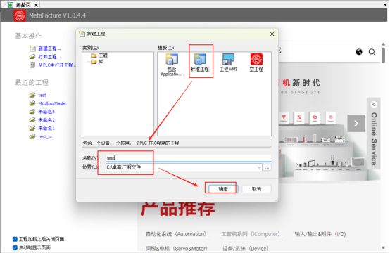 ③选择”标准工程“,输入工程名称以及存储位置,点击“确认”;