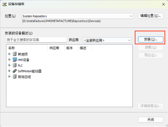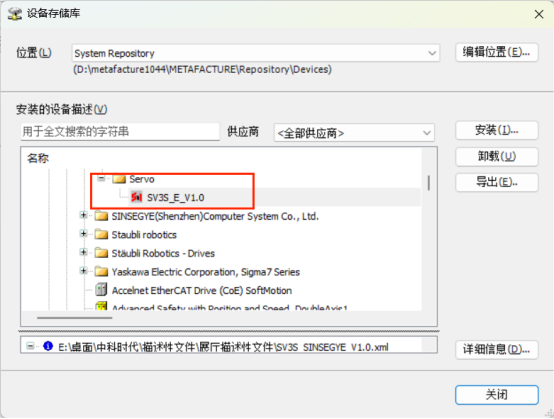 如果是其他设备(例如伺服电机)的XML文件需要手动添加,未默认集成在安装包中。具体操作流程如下: