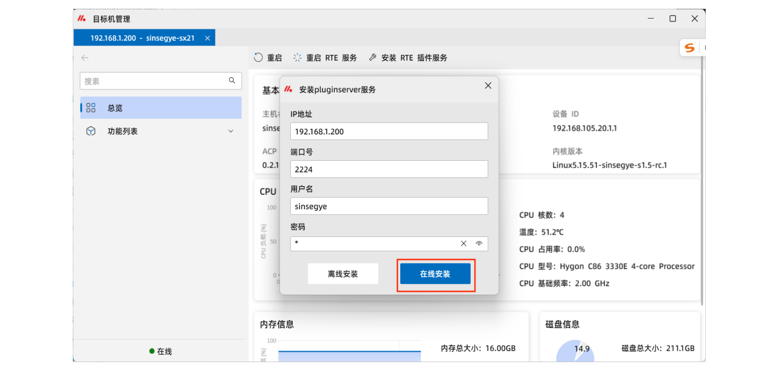 6.输入工智机IP、用户名和密码,点击“在线安装”
