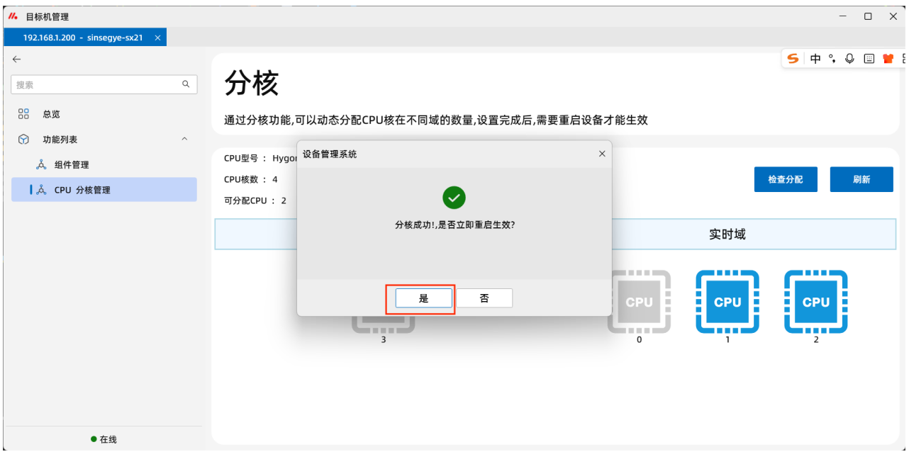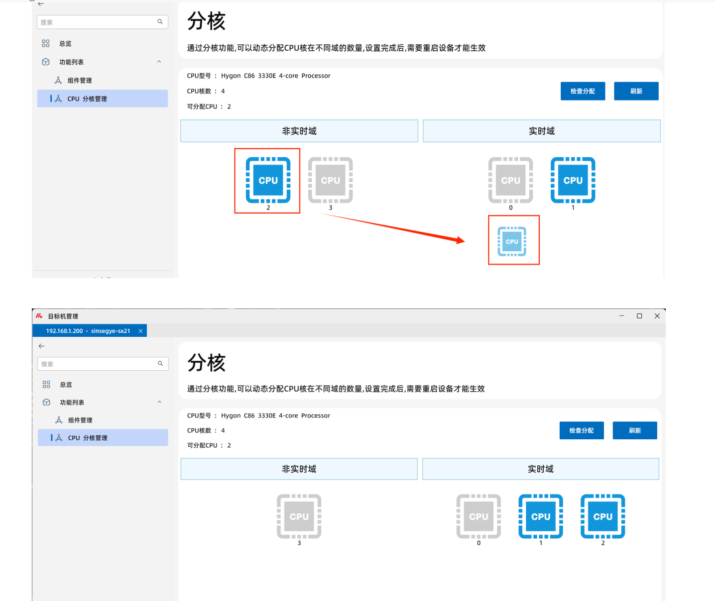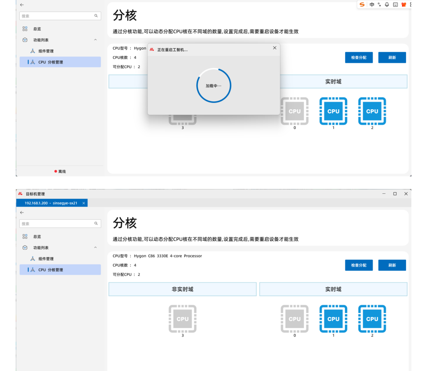14.点击“CPU分核管理”,可以查看非实时域和实时域的CPU分配情况。