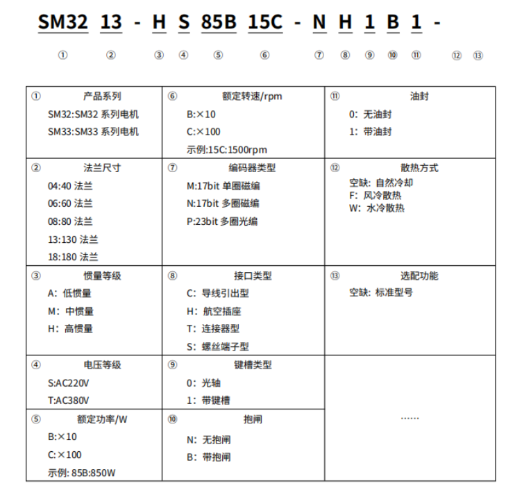 | ① | SM32 | 产品系列 | SM32 系列电机 |