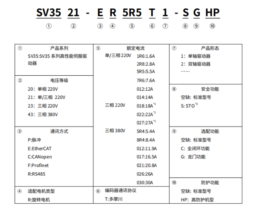 | ① | 产品系列 | SV35:SV35/SV35 系列高性能伺服驱动器 |