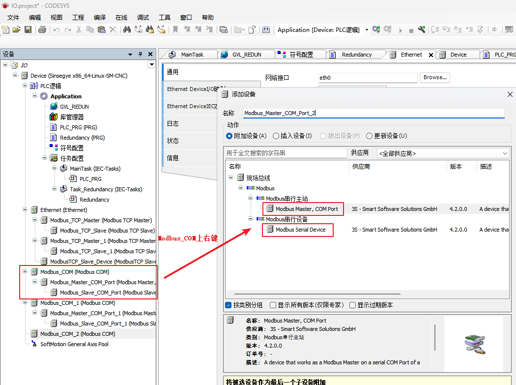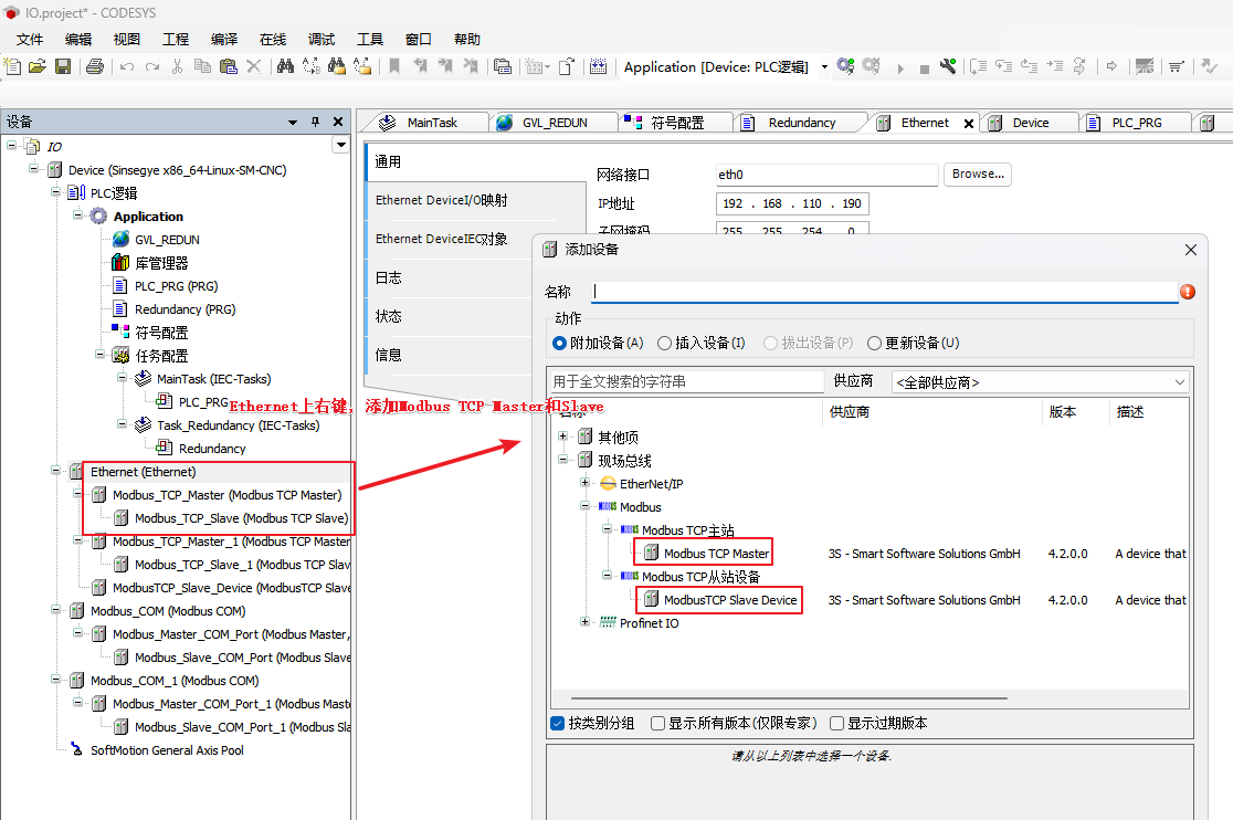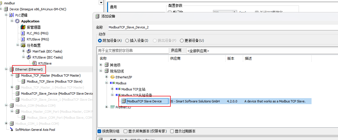 添加Modbus TCP主从站:[Device]右键添加Ethernet设备-->[Ethernet]-->右键添加Modbus TCP Master和Slave