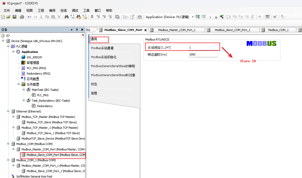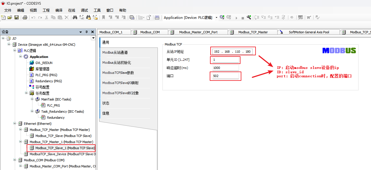 注:添加slave之后,[通用]下不显示[单元ID],需要通过[ModbusTCPSlave参数]页面配置