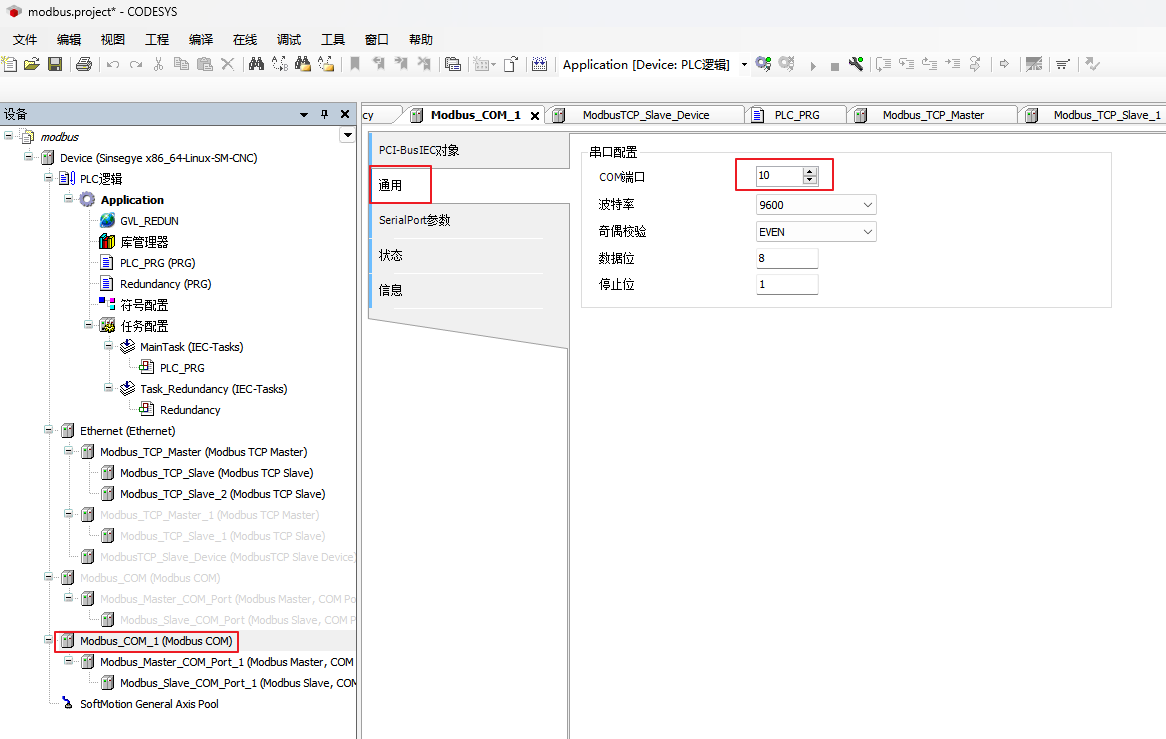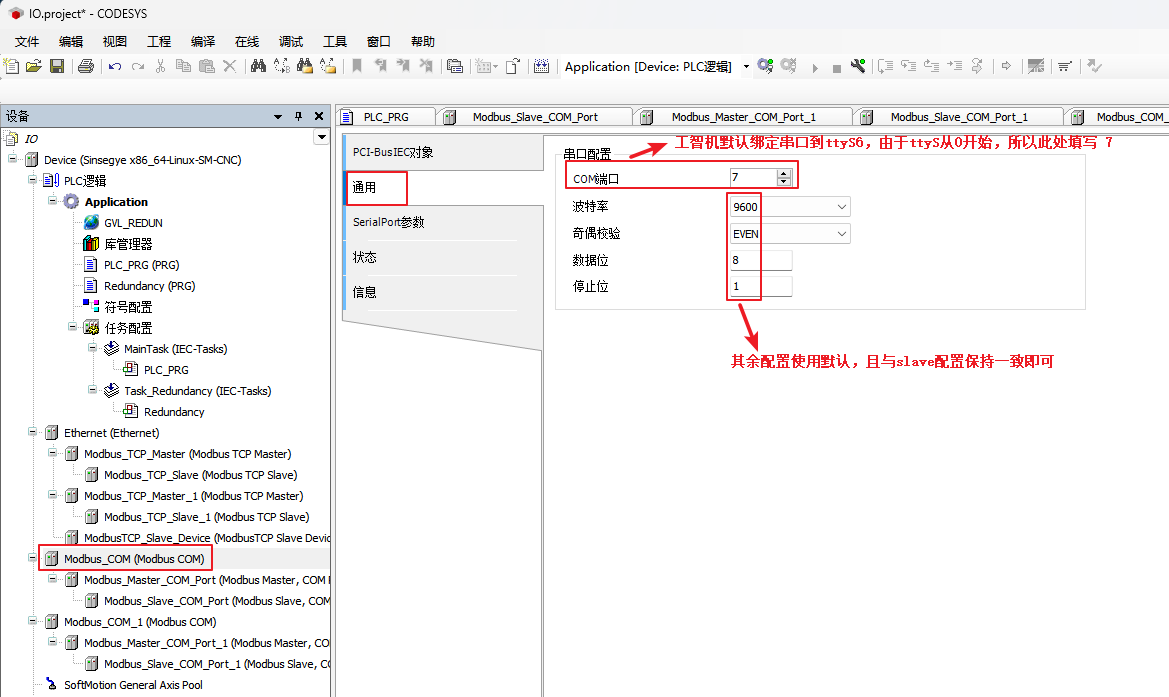 codesys下COM端口配置与工智机配置文件中保持一致