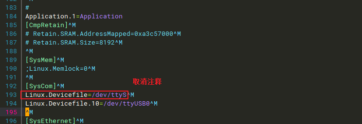 取消[SysCom]下,Linux.Devicefile=/dev/ttyS 的注释