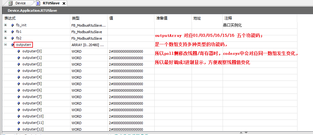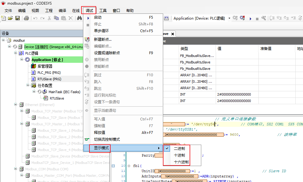 所以poll侧修改线圈/寄存器时,codesys中会对应同一数组发生变化,因此最好调成2进制显示,方便观察线圈值变化
