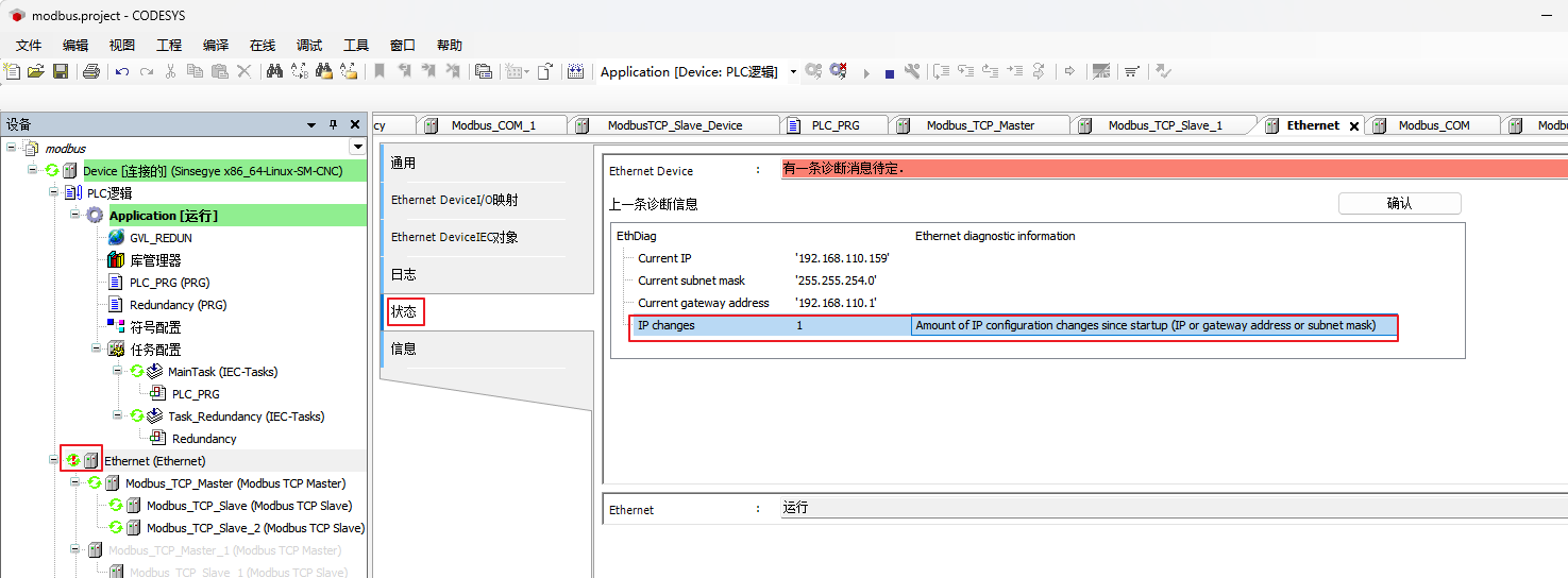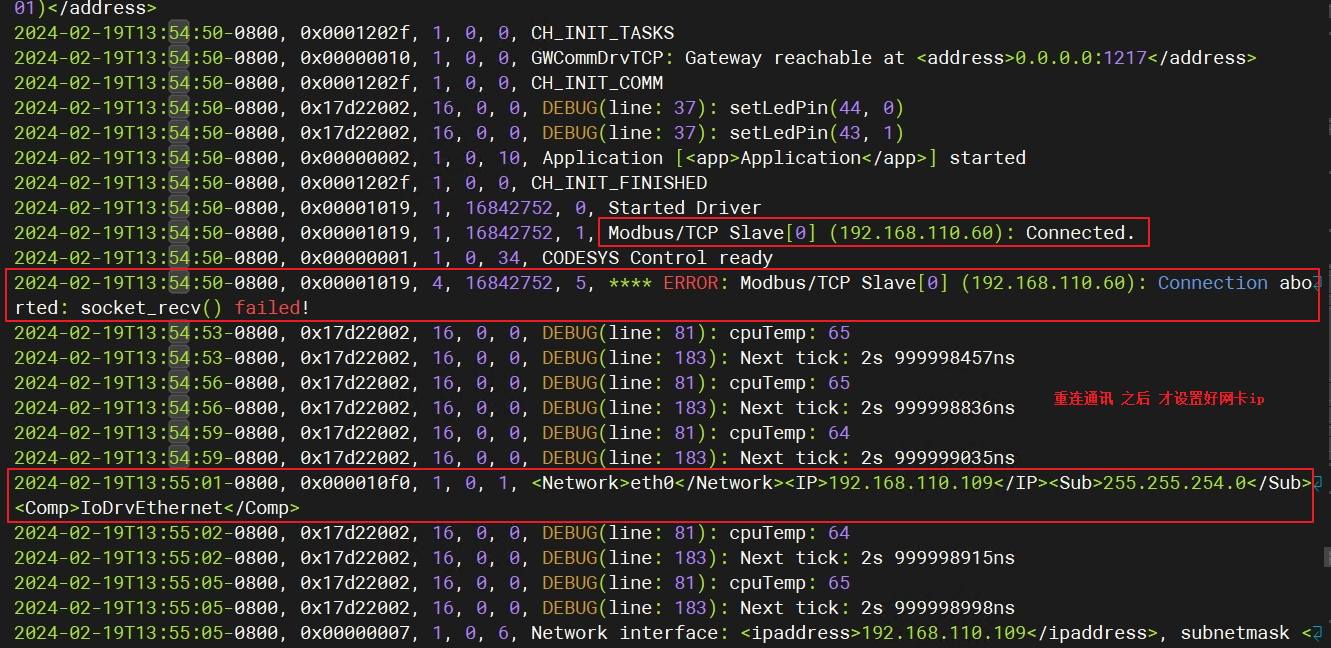 注:重启工智机/RTE,通讯未自动恢复;codesys中有错误提示,点击确认后正常