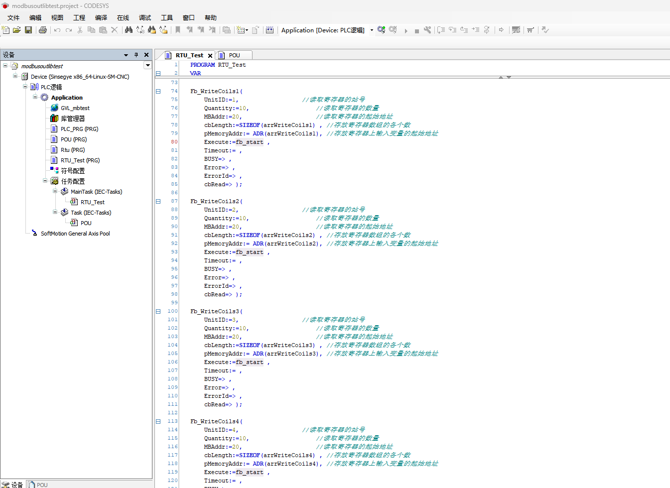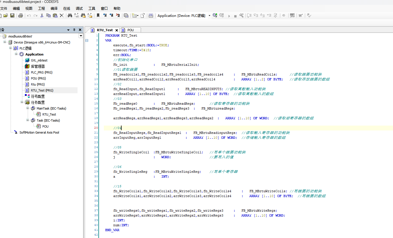 编写ST进行modbus测试,不需要添加设备
