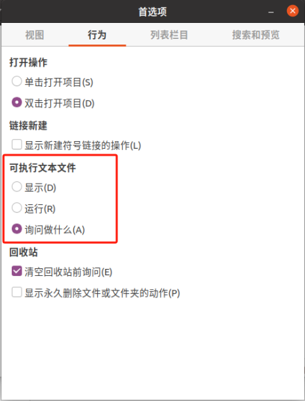 进入“行为”选项卡,将“可执行文本文件”下的选项改为“询问做什么”,如图