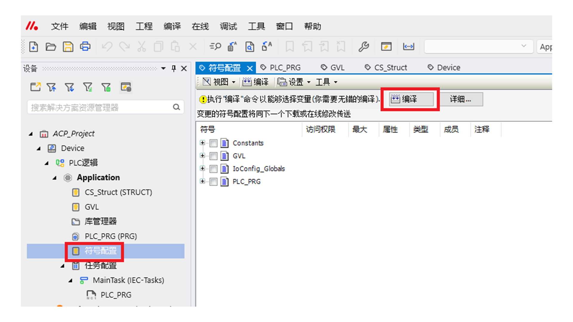 答:查看PLC程序,是否添加“符号配置”,以及符号配置中是否进行“编译”。