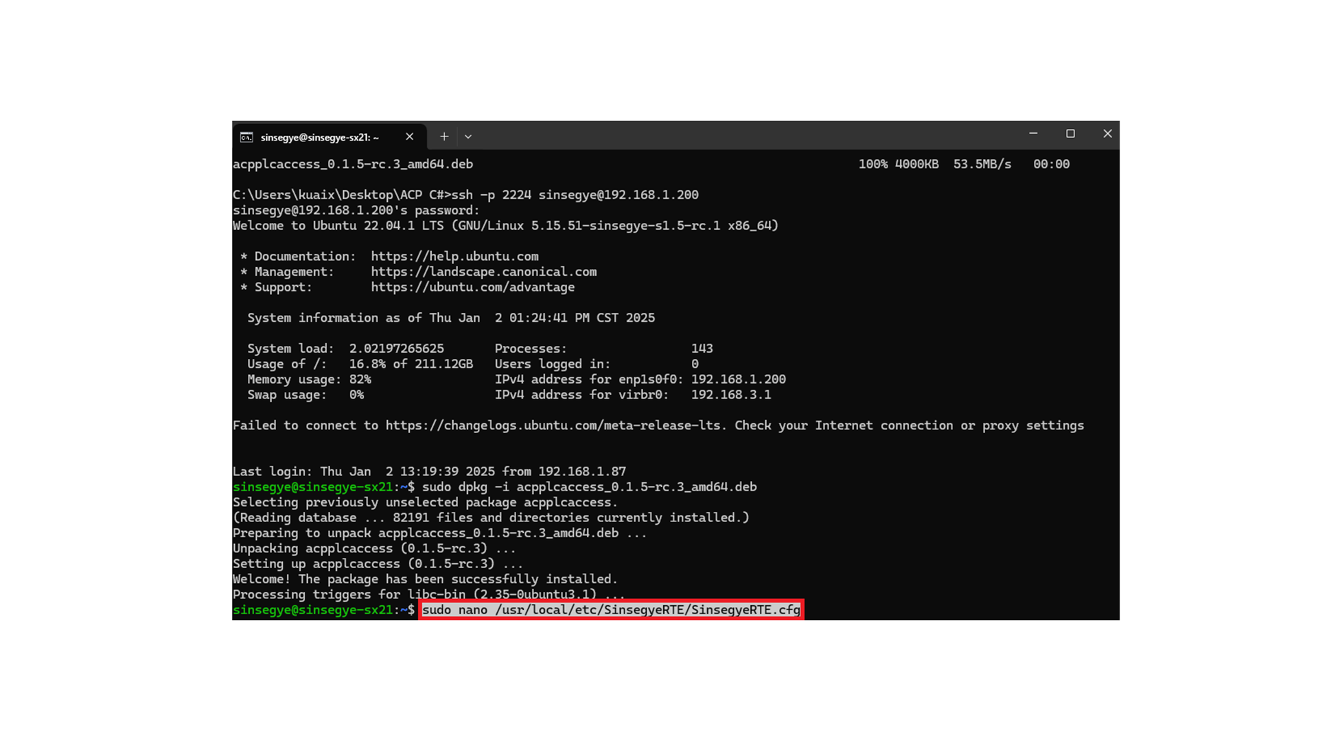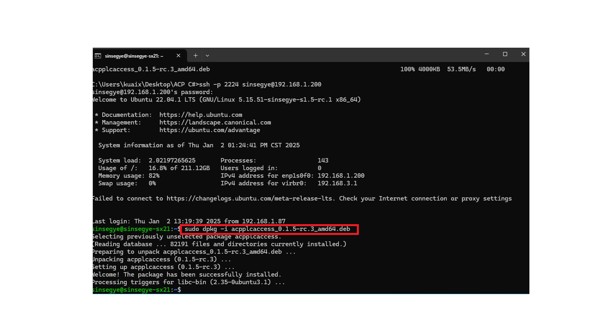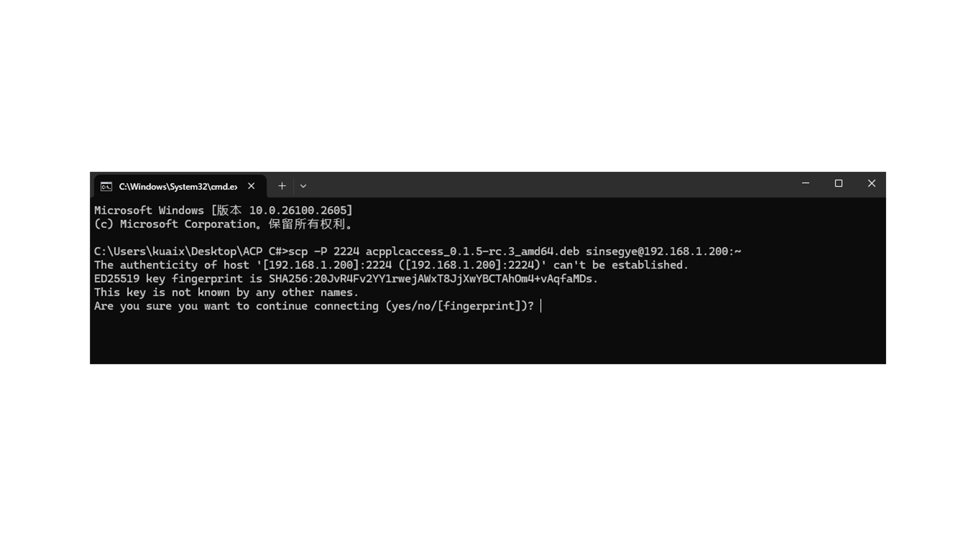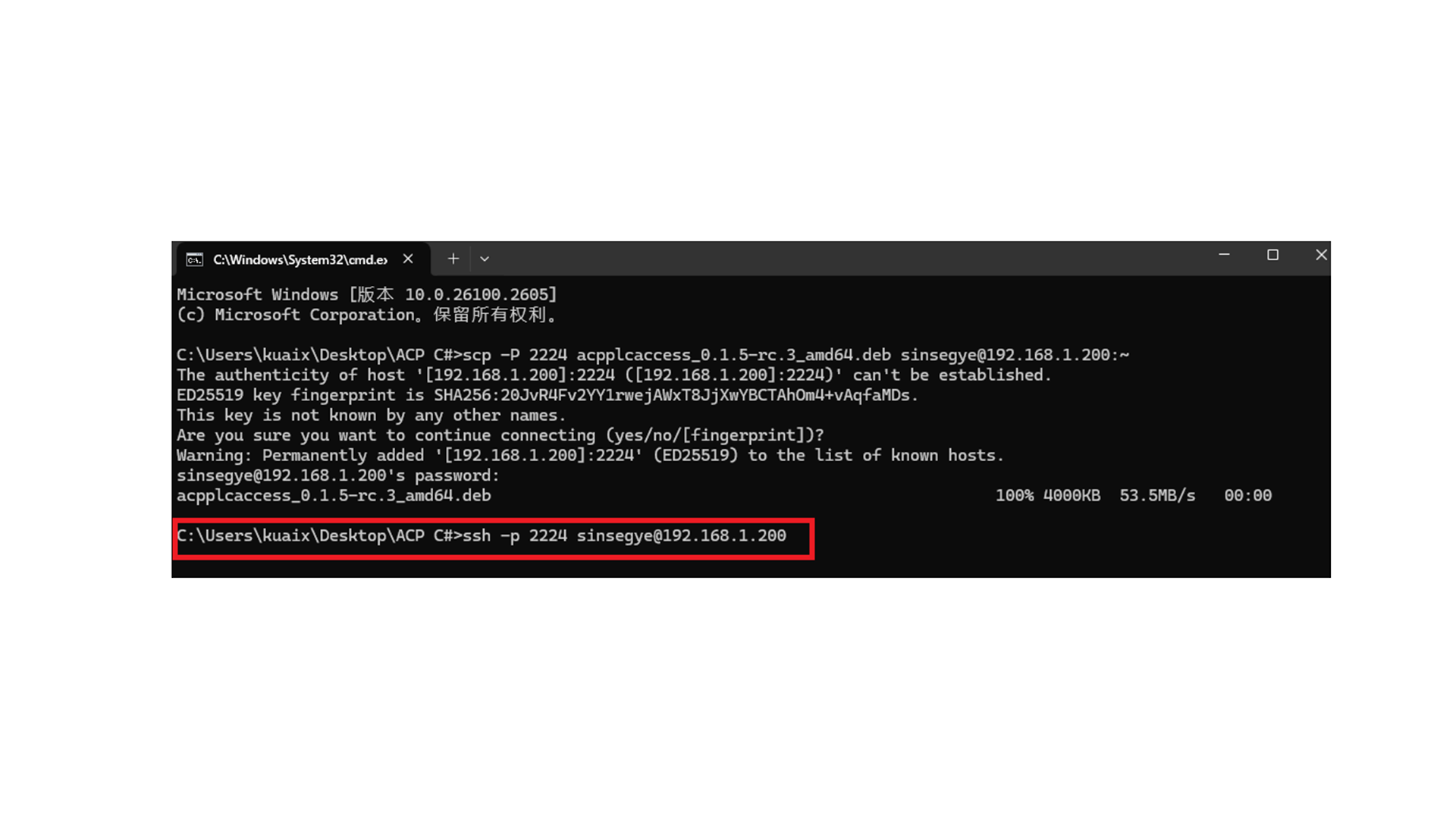 4.通过scp命令将acpplcaccess_0.1.5-rc.3_amd64.deb文件传输到客户端工智机中。