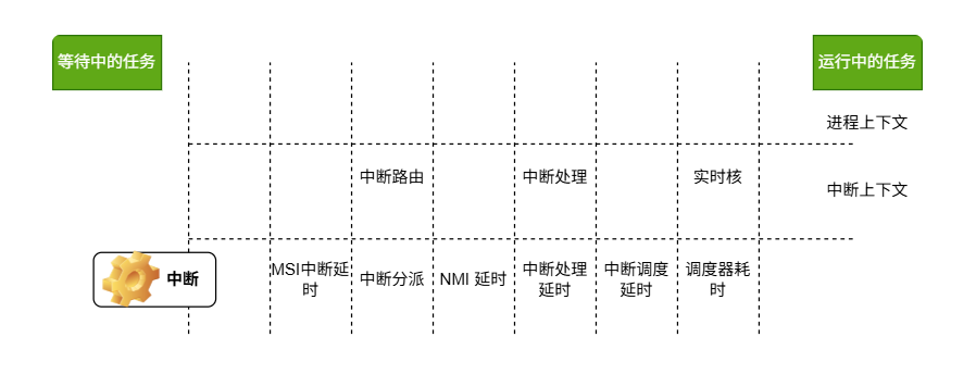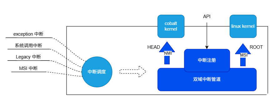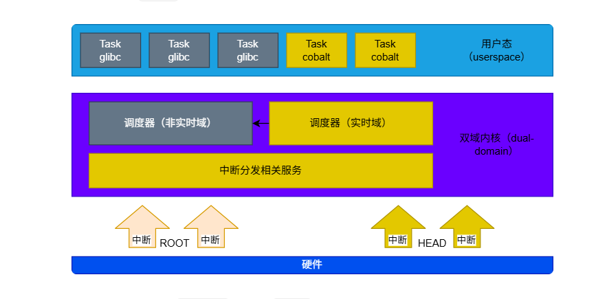 Cobalt 补丁 Linux 内核在硬件中断上占据主导地位,这些中断原本属于 Linux 内核。Cobalt 将首先处理它感兴趣的中断,然后将其他中断路由到 Linux 内核。前者称为 head stage,后者称为 root stage: