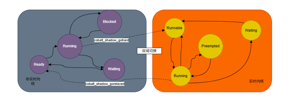 Cobalt 核心的线程并不是完全与 Linux 内核的线程隔离。相反,它重用了普通的 kthread 并添加了特殊功能;kthread 可以在 Cobalt 的实时上下文(out-of-band 实时域)和普通的 Linux 内核上下文(in-band 非实时域)之间切换。其优势在于,当处于实时域上下文时,线程可以利用 Linux 内核的基础设施。在典型场景中,Cobalt 线程会以普通 kthread 的形式启动,调用 Linux 内核的 API 进行准备工作,然后切换到实时域上下文,作为 Cobalt 线程执行实时工作。其劣势在于,处于实时域上下文时,Cobalt 线程很容易因为误调用 Linux 内核 API 而迁移到非实时上下文。在这种情况下,问题很难被发现;开发者通常误认为他们的线程正在 Cobalt 核心下运行,直到检查 ftrace 输出或任务超出其截止期限时才注意到问题。