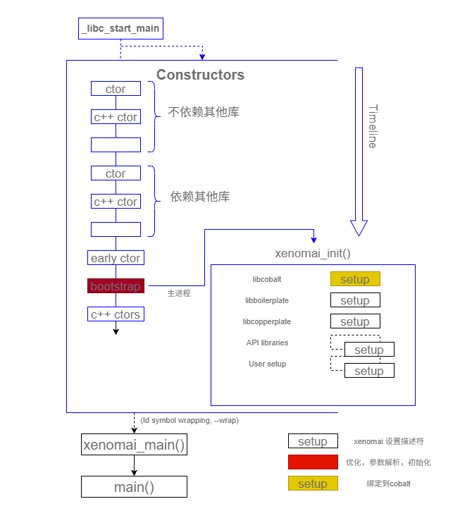 如果你有使用非默认构造优先级的静态对象,或者你的执行文件依赖于实例化了静态对象的共享库,你可能需要在这些构造函数尝试调用 Cobalt 服务之前,提供自己的早期引导代码。这包括在合适的时间点调用 xenomai_init(),以确保在这些静态构造函数运行时,Cobalt 服务已经可用。