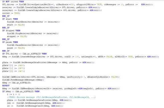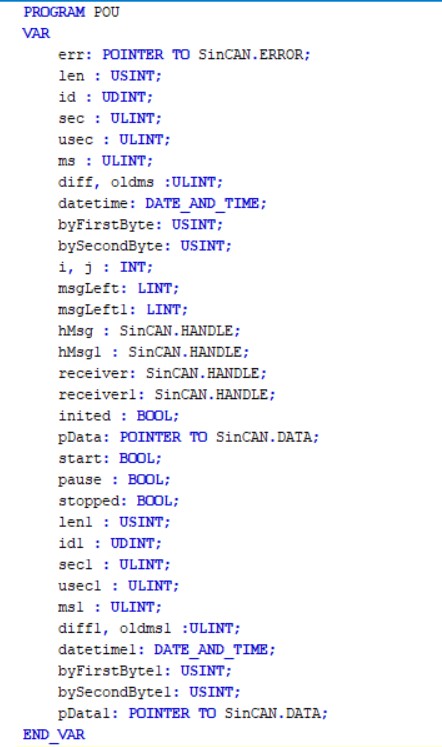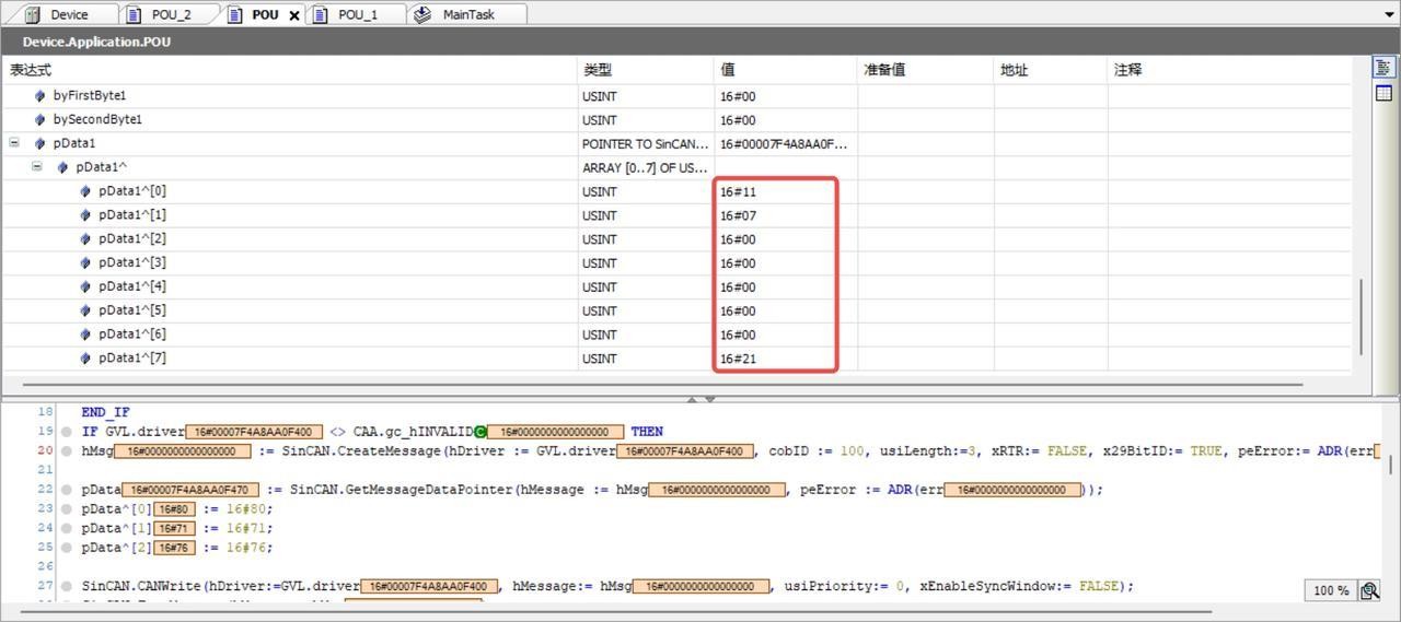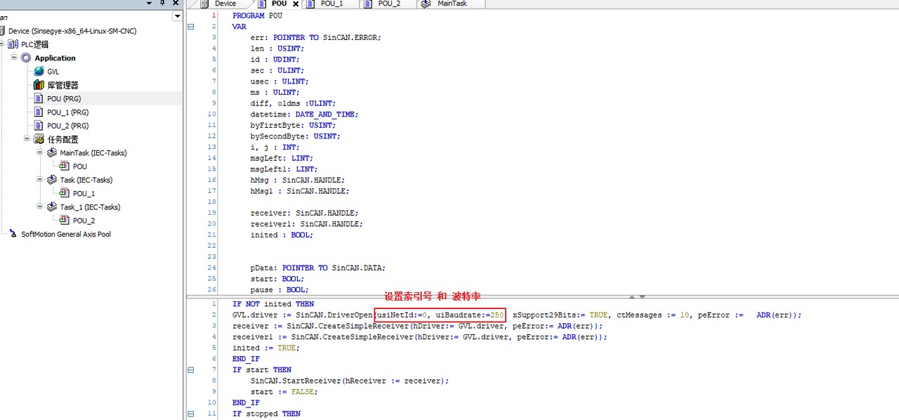 在 PLC(PRG)程序中,usiNetId:设置索引号,工智机中的 can 节点对应;uiBaudrate: 设置波特率,对应工智机 /usr/local/etc/SinsegyeRTE/device_config.yaml 文件中can_interfaces 下 bitrate 值,在程序中可以修改 usiNetId 和 uiBaudrate 的值,如下图。