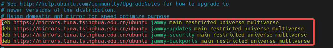 sudo vim /etc/apt/sources.list,将下面这四行的注释取消掉,如下图所示。