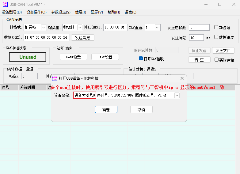 选择设备,注意 索引号的值,连接多个 CAN 盒子时,区分设备使用。该值与工智机中初始化的 can 节点一致,如下图。