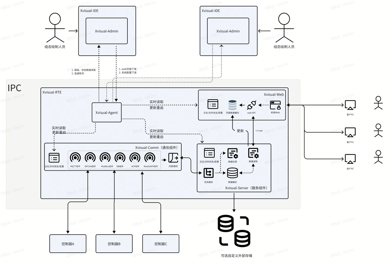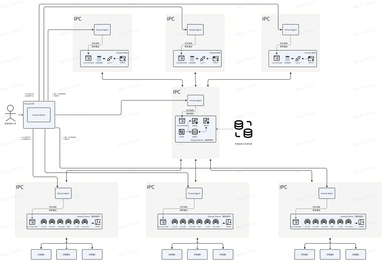 Xvisual软件具有多层结构。软件中包含的应用程序(服务)使用TCP协议相互交互。Xvisual可以部署与IPC或客户PC内Xvisual既可以支持单机部署使用,也可支持分布式部署使用。
