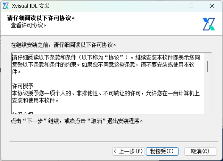 如果系统提示需要管理员权限来运行安装程序,请确认允许。Xvisual IDE 的安装程序可能会要求管理员权限来写入系统文件和注册表项。