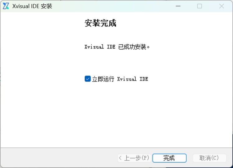 安装完成后,点击“完成”按钮,Xvisual IDE 会自动启动。默认情况下,安装程序会将 Xvisual IDE 安装到 C:\Xvisual\Xvisual IDE 目录。安装程序将在桌面和开始菜单中自动创建 Xvisual IDE 的快捷方式。完成安装后,你可以通过这些快捷方式快速启动 Xvisual IDE。