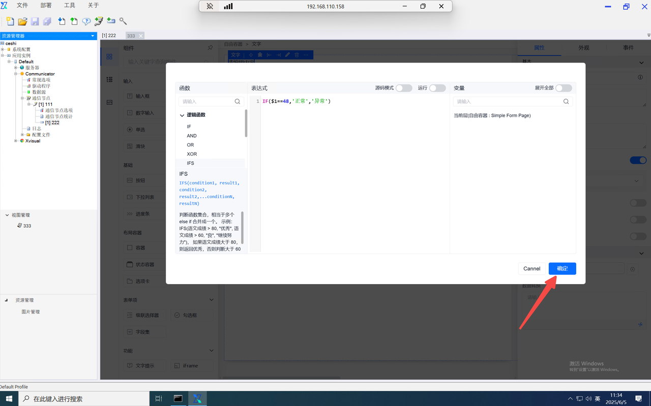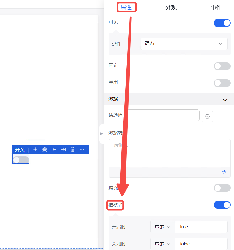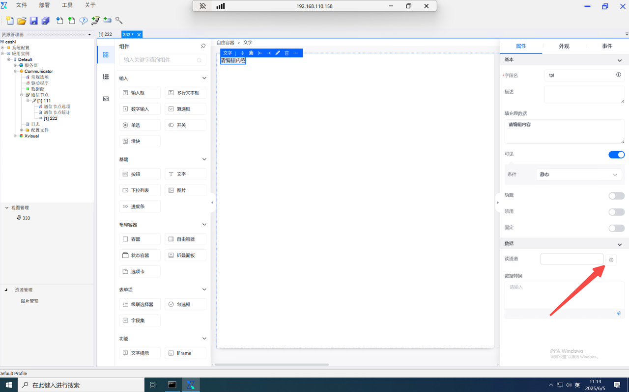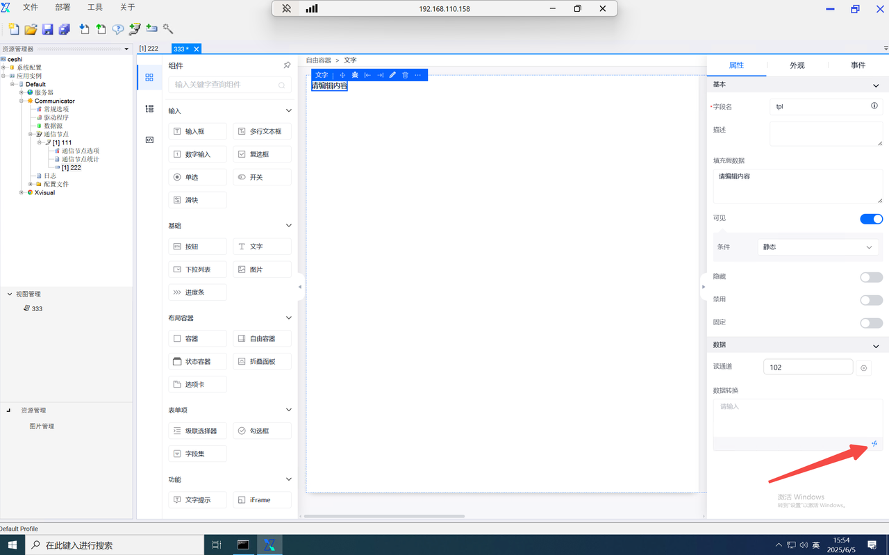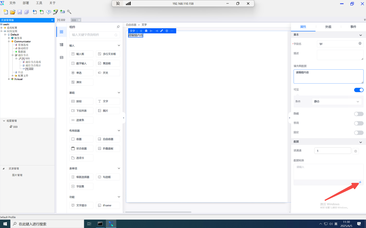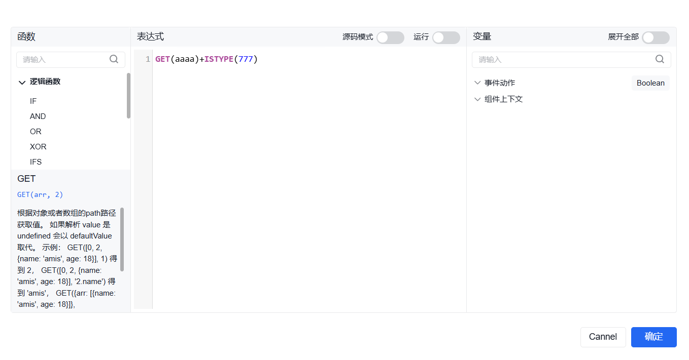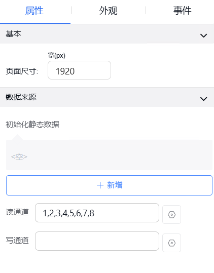function内的data为当前组态编辑器页面内的全局data对象,当需使用自定义的key对象时,仅需输入data.key即可使用,并设置value。如需使用其他页面内的数字,则输入该组件的字段名并进行使用。如需使用组件内绑定的通道,则在组件字段名后使用".$通道号"进行使用。