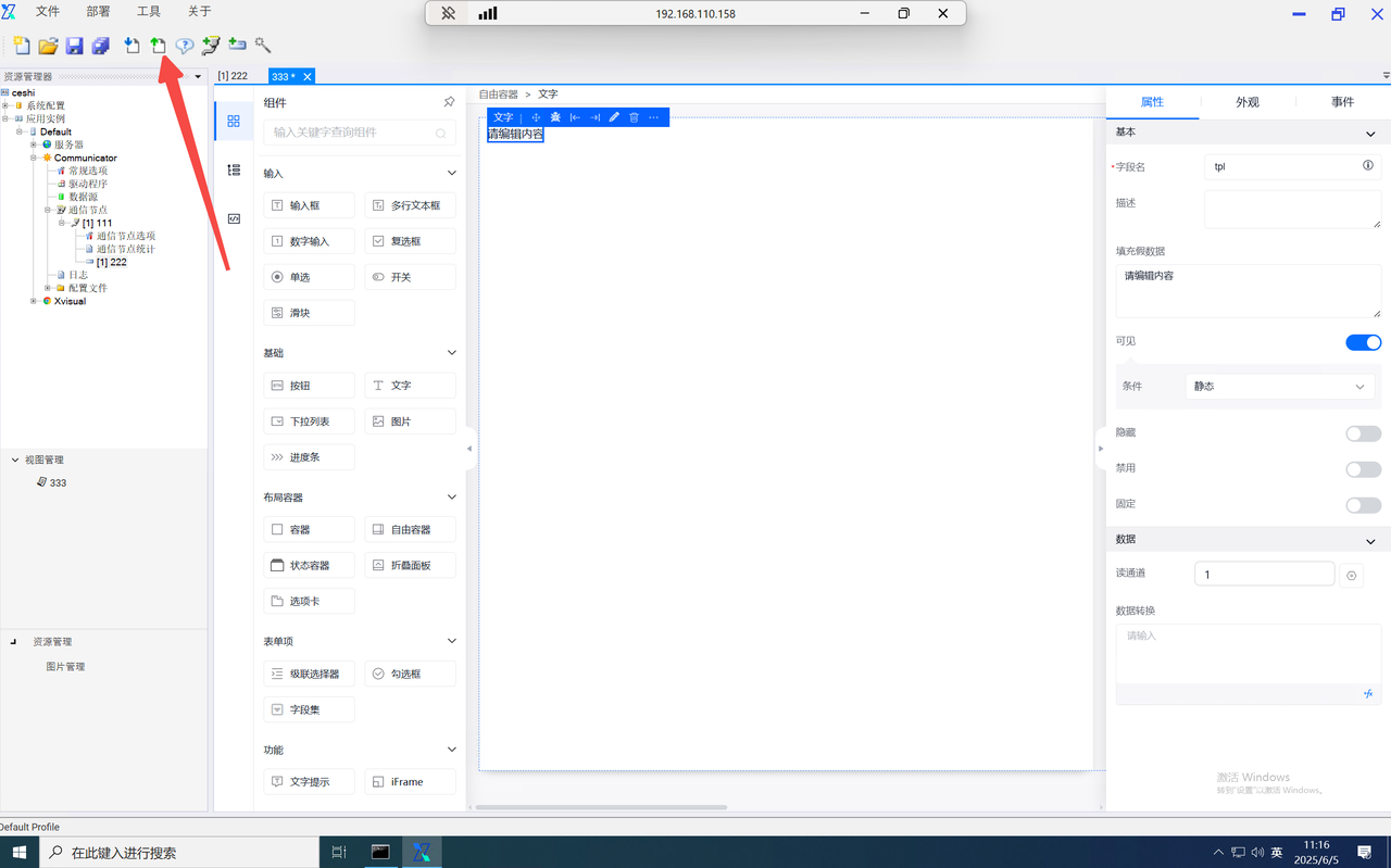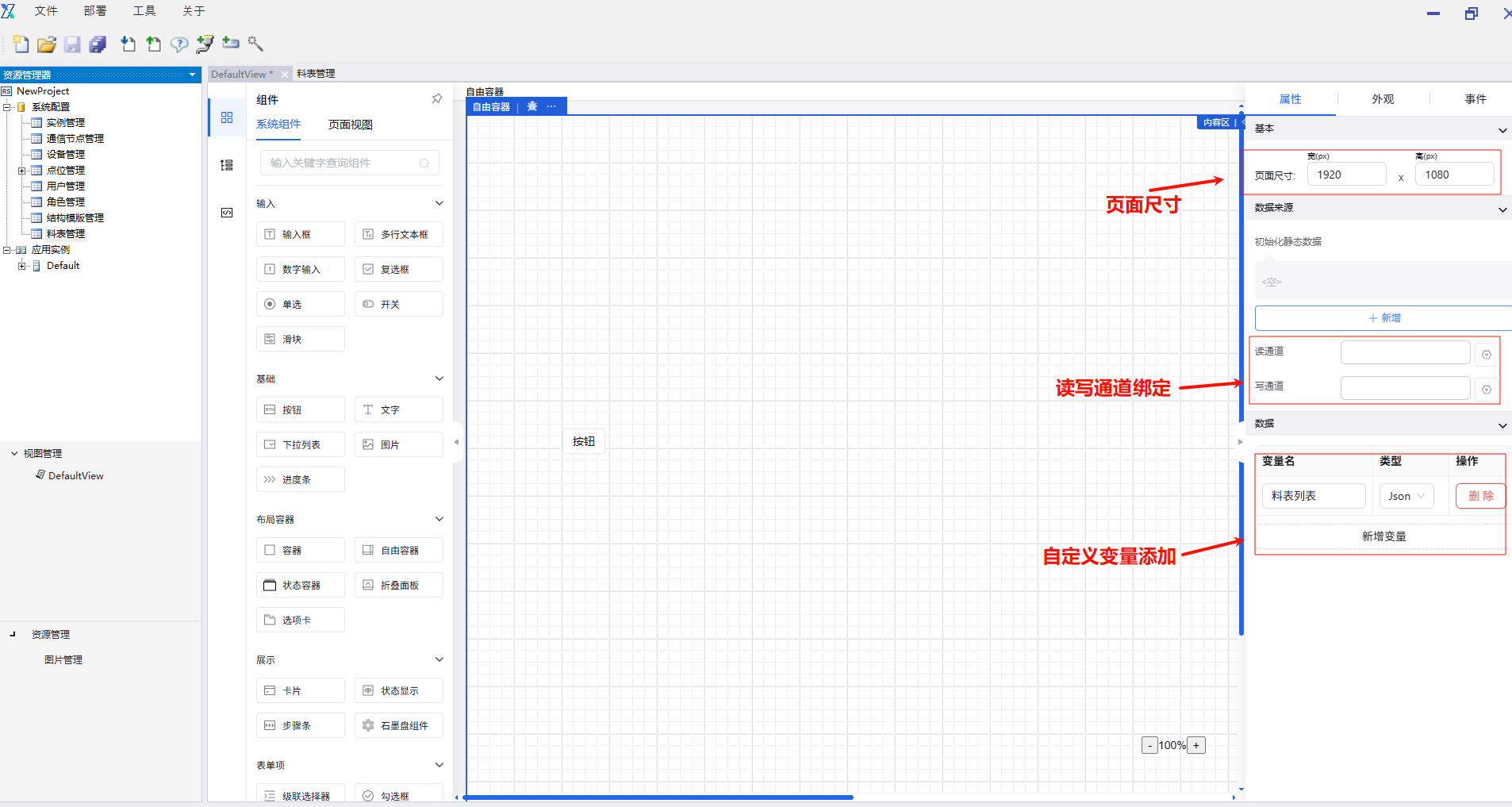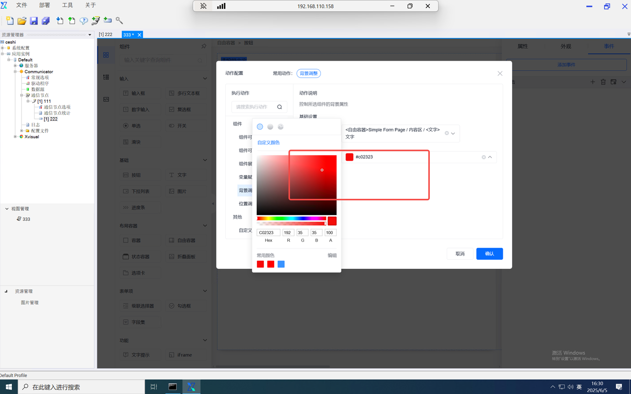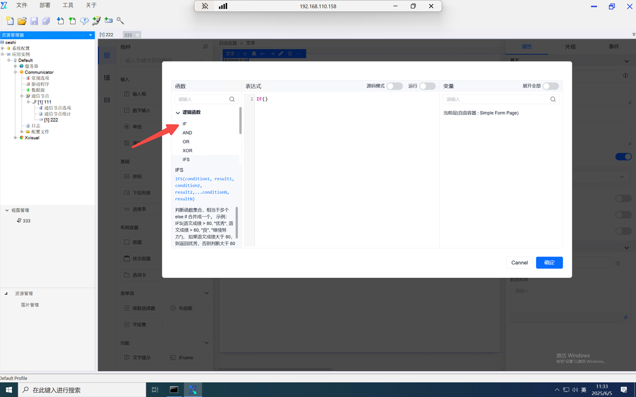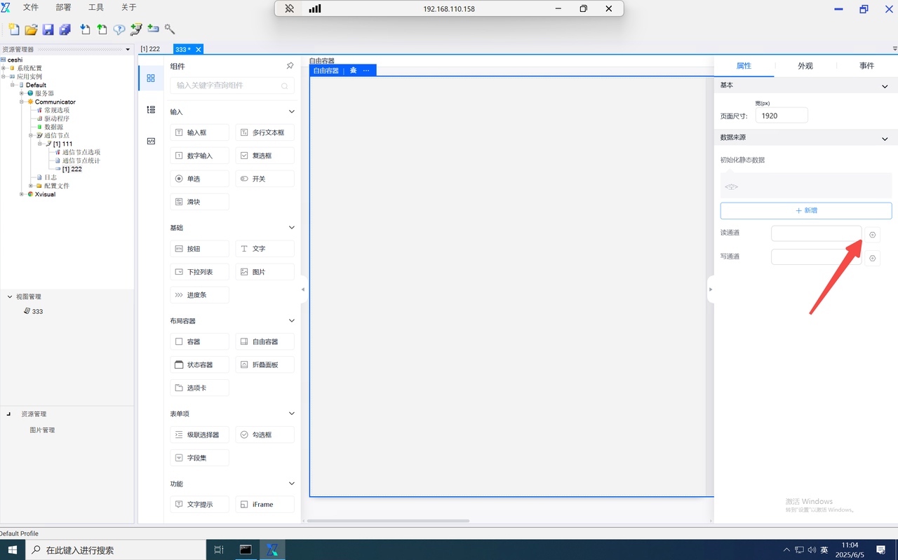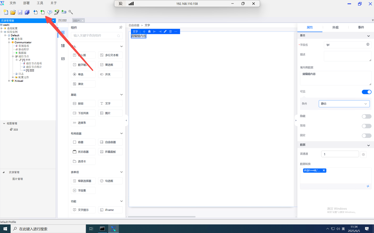 function内的data为当前组态编辑器页面内的全局data对象,当需使用自定义的key对象时,仅需输入data.key即可使用,并设置value。如需使用其他页面内的数字,则输入该组件的字段名并进行使用。如需使用组件内绑定的通道,则在组件字段名后使用".$通道号"进行使用。