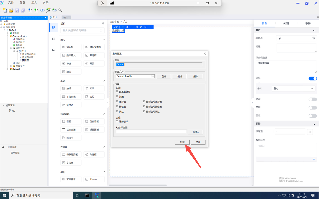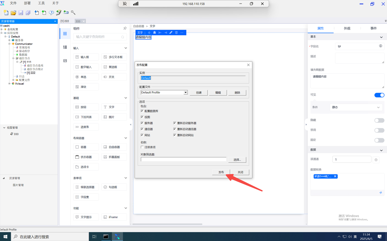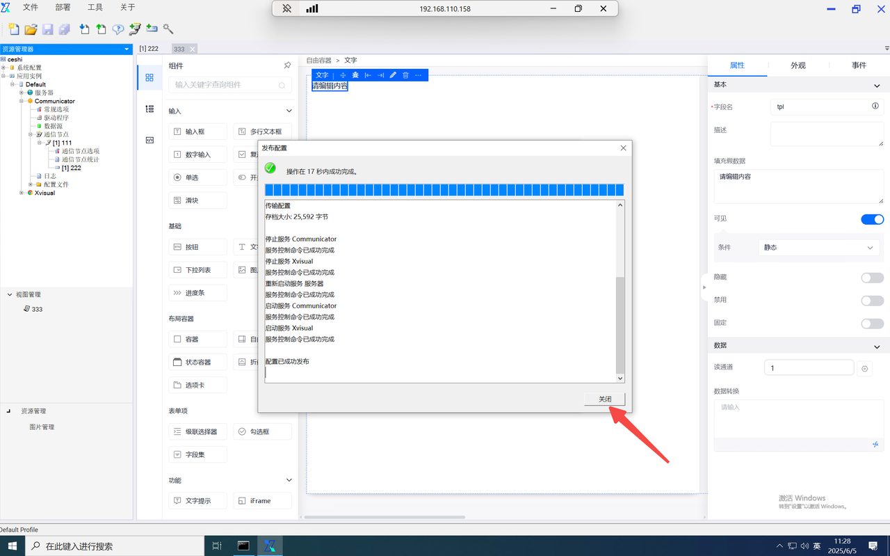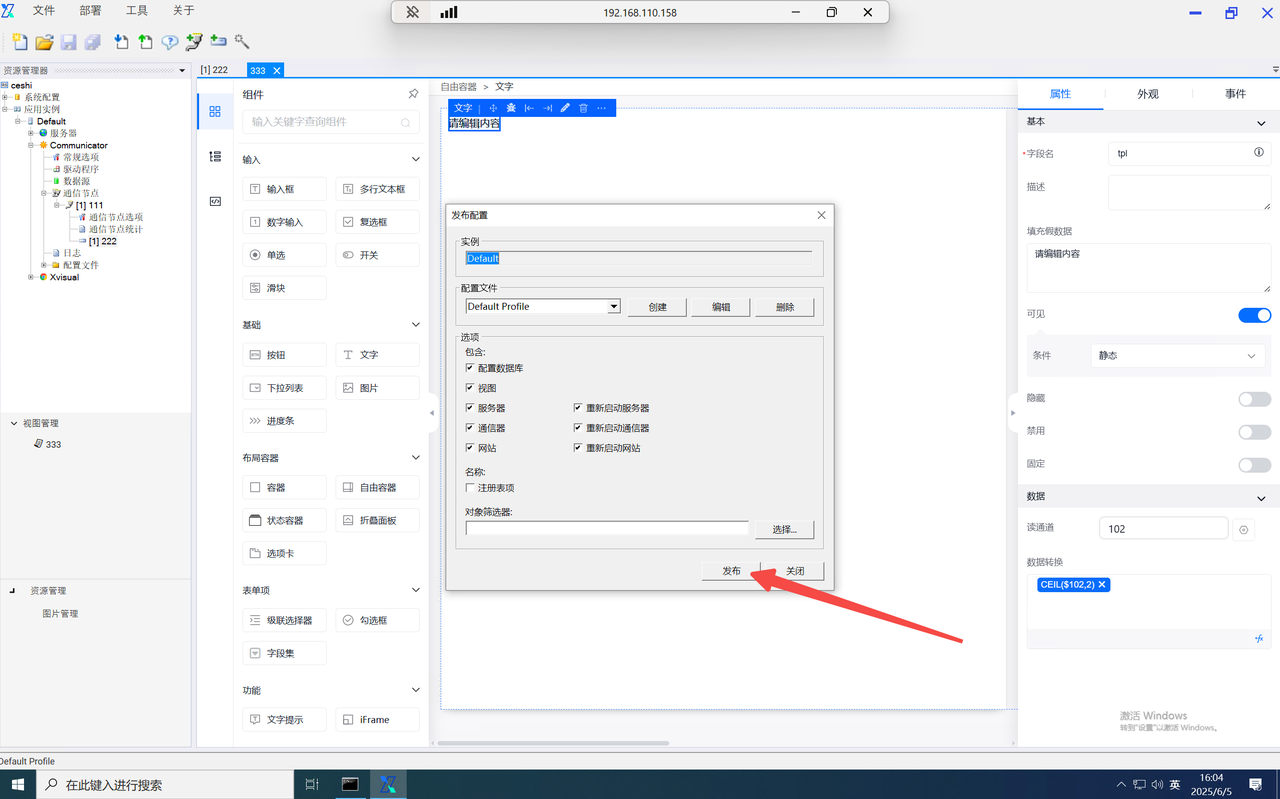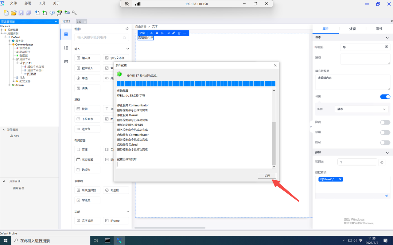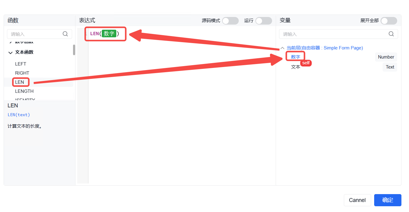 function内的data为当前组态编辑器页面内的全局data对象,当需使用自定义的key对象时,仅需输入data.key即可使用,并设置value。如需使用其他页面内的数字,则输入该组件的字段名并进行使用。如需使用组件内绑定的通道,则在组件字段名后使用".$通道号"进行使用。