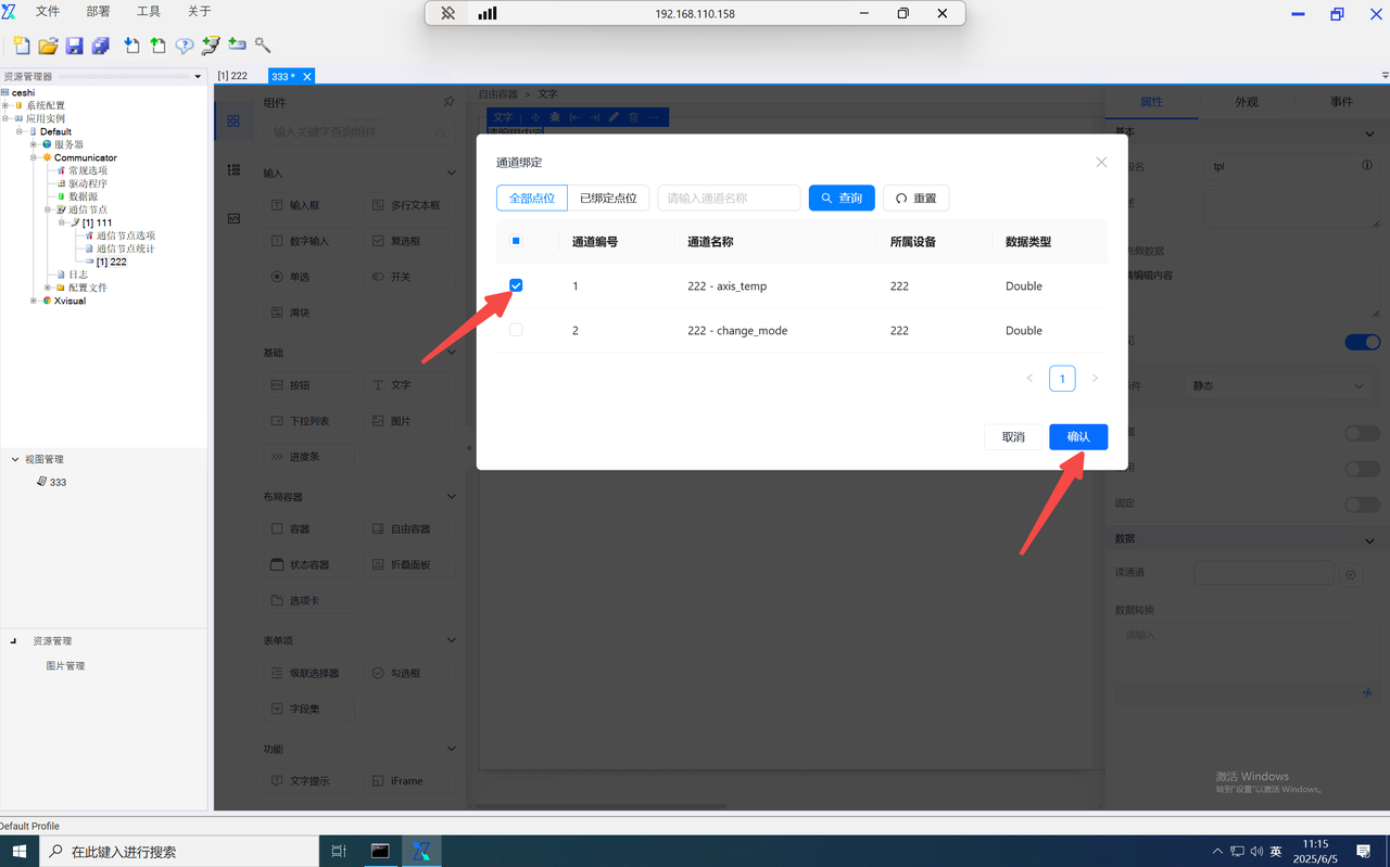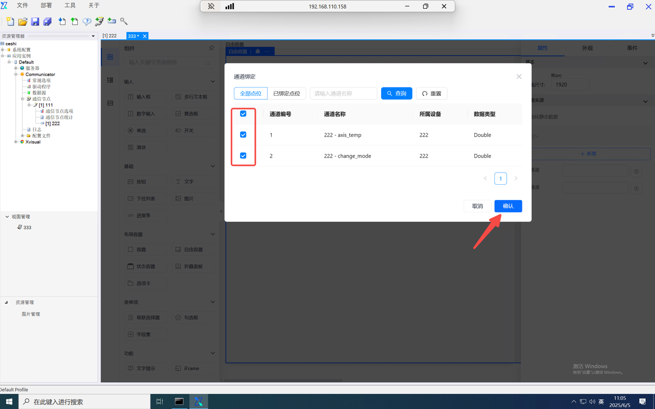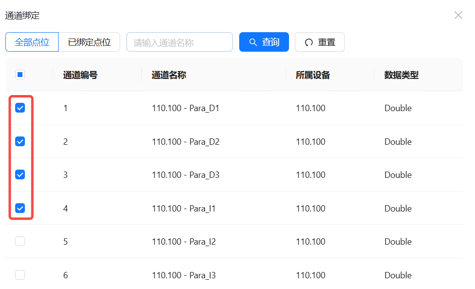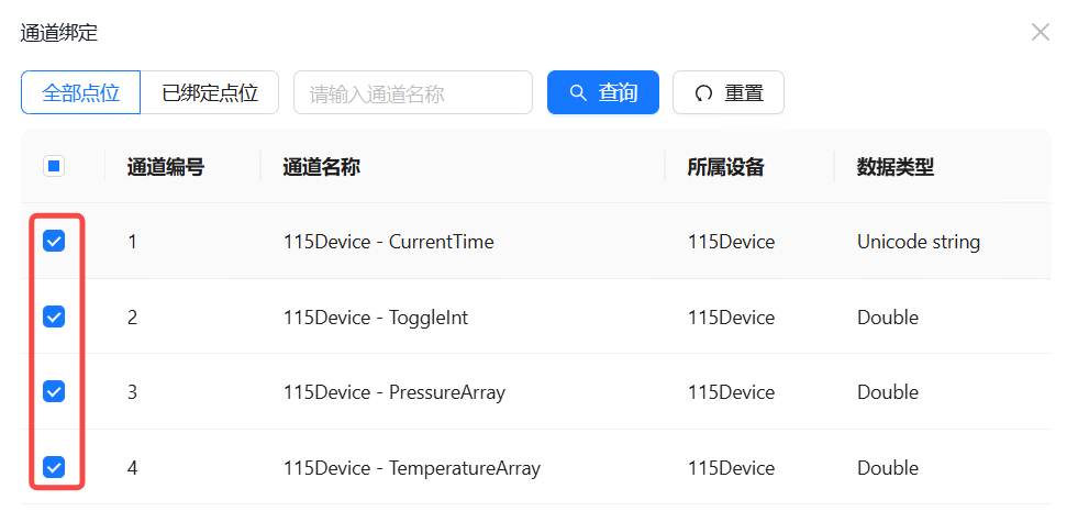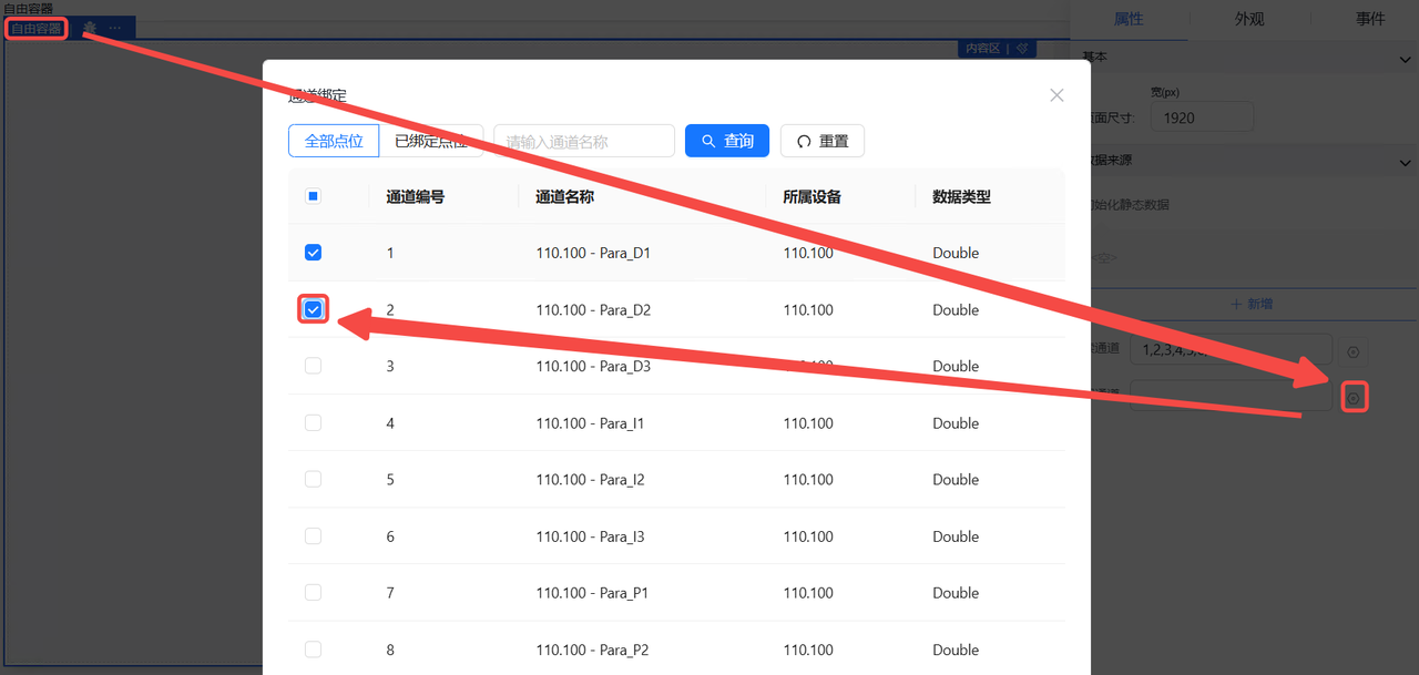 点击新增下发点位,点击通道选择,弹出通道选择弹窗,在弹窗内勾选需要下发对应指令的通道,点击确定。指令弹窗内出现仅包含当前页面内自由容器已经添加的写通道列表,弹窗内只能选择一个通道。同时在同一个指令下发操作操作中,一个通道只能被绑定操作一次。