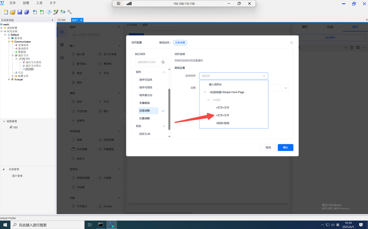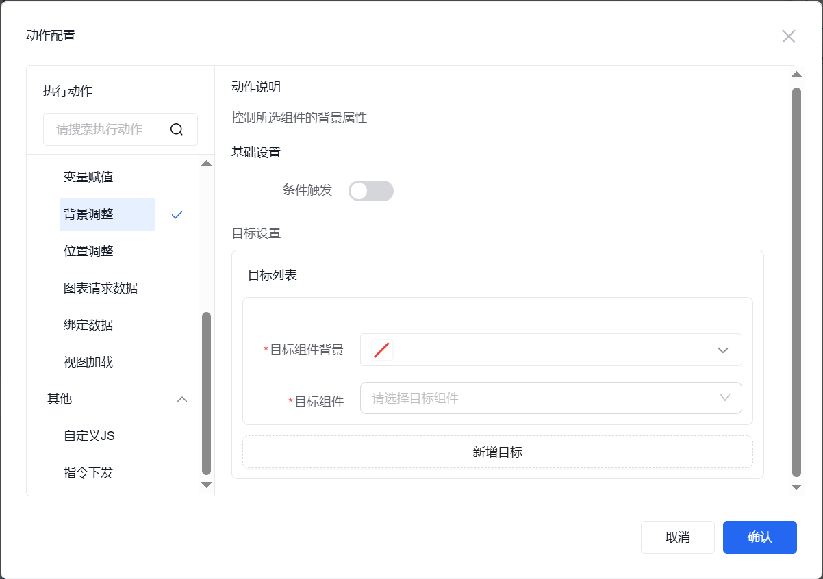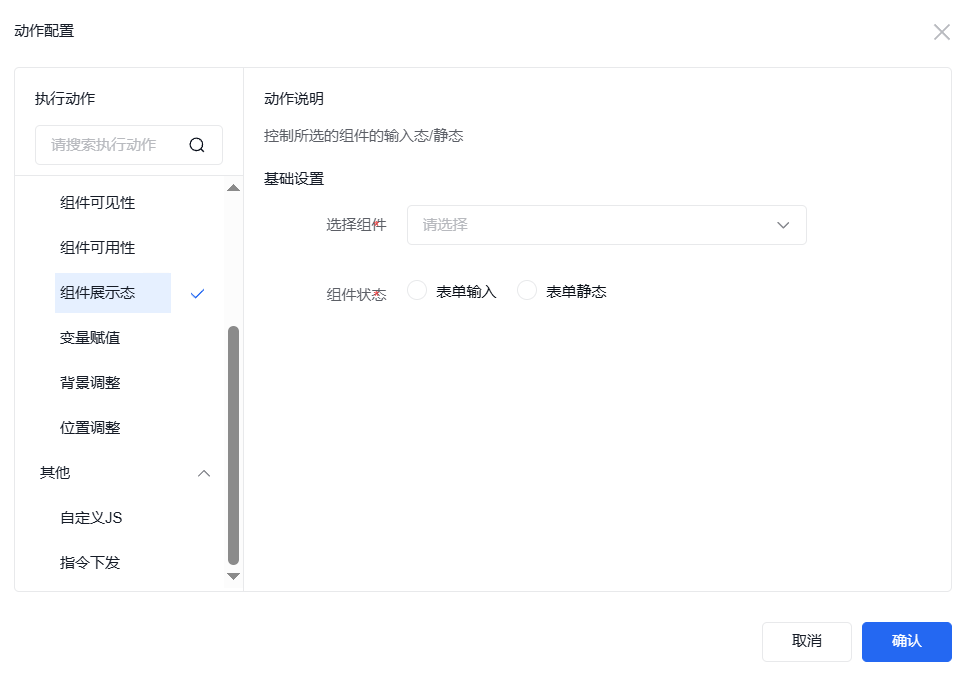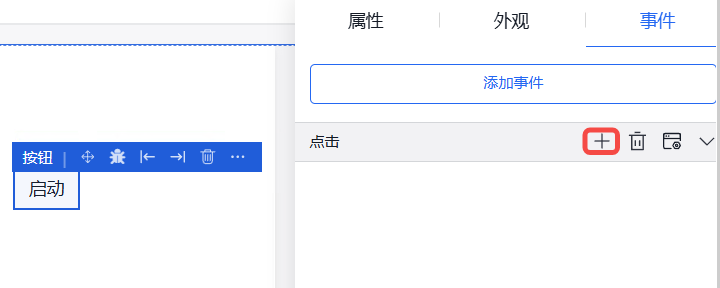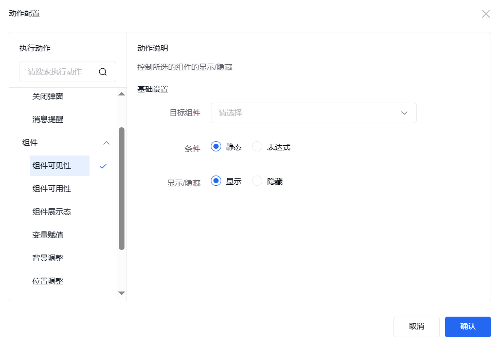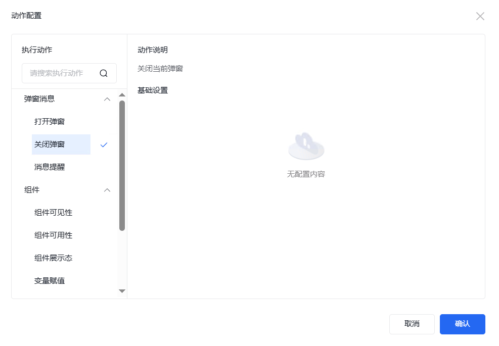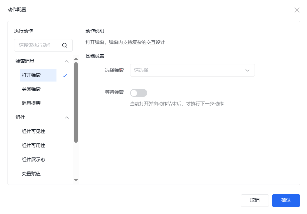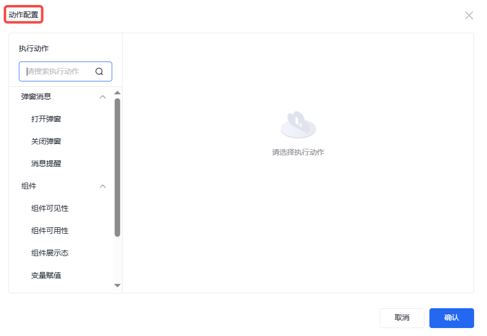 添加事件“点击”,点击“+”,即可出现“动作配置”弹窗来配置相关的执行动作。