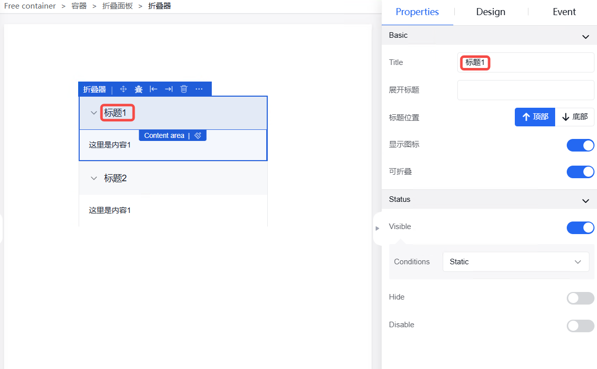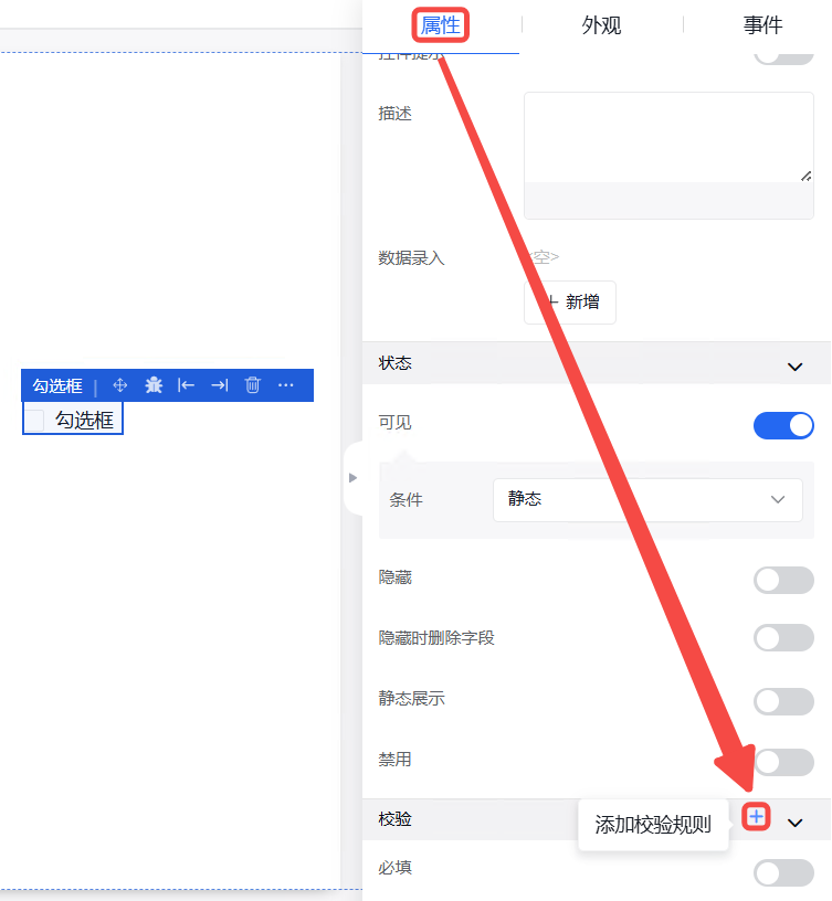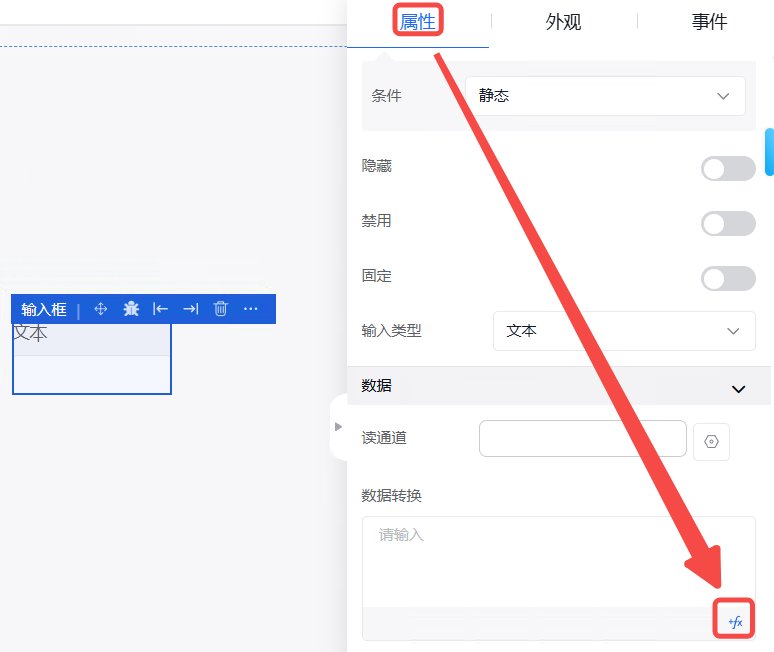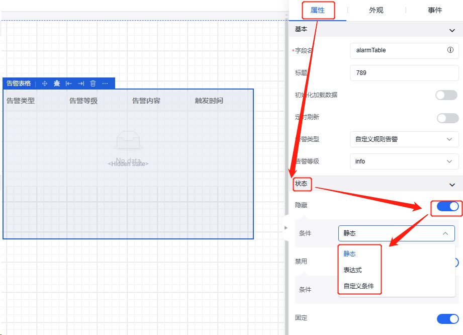 点击“属性”,找到状态栏,可以修改告警表格状态,有“隐藏”、“禁用”、“固定”三种状态,点击后面的相关按钮即可开启,同时可以设置条件,例如:静态。