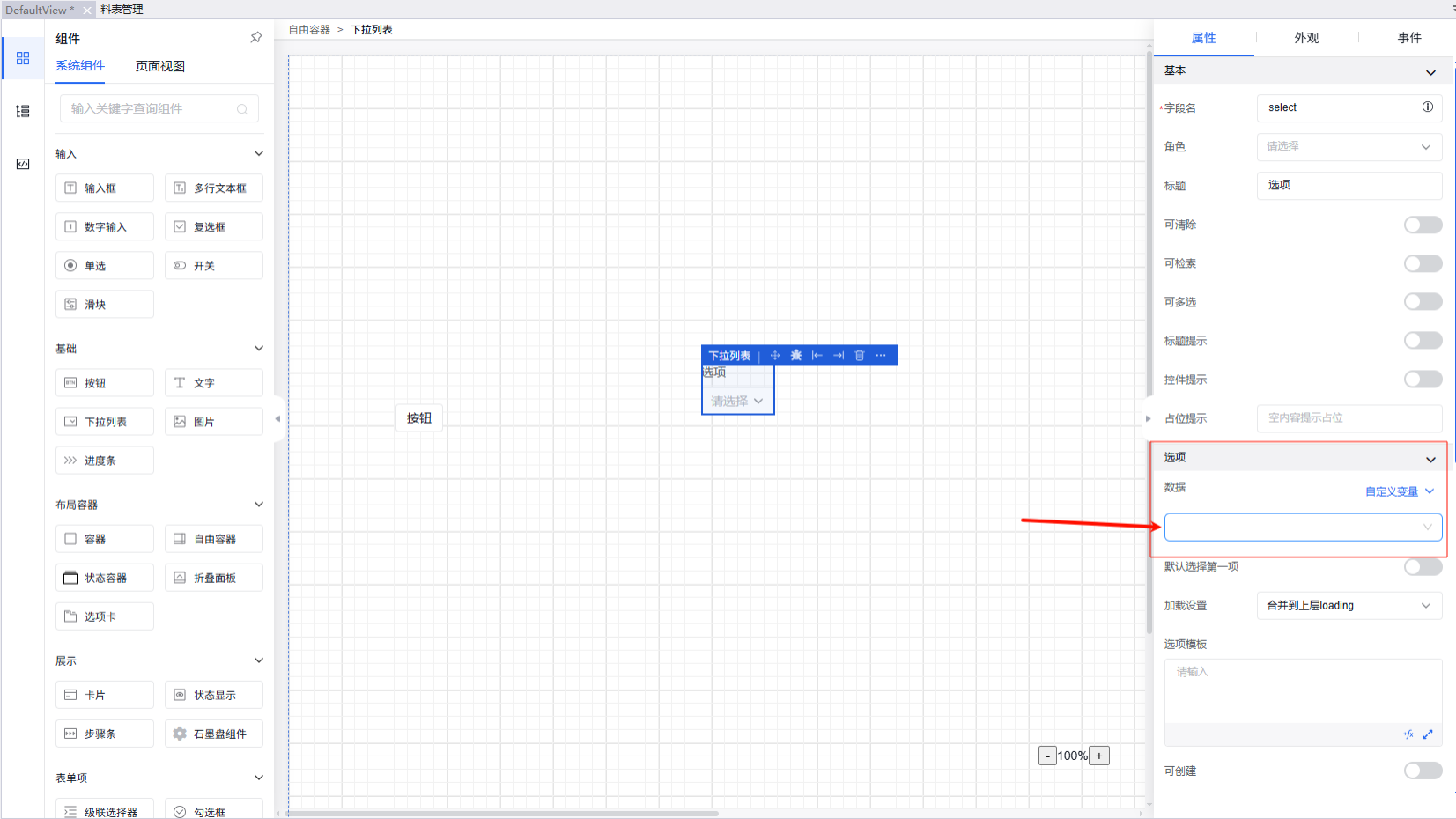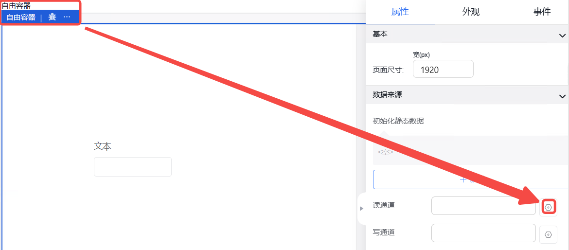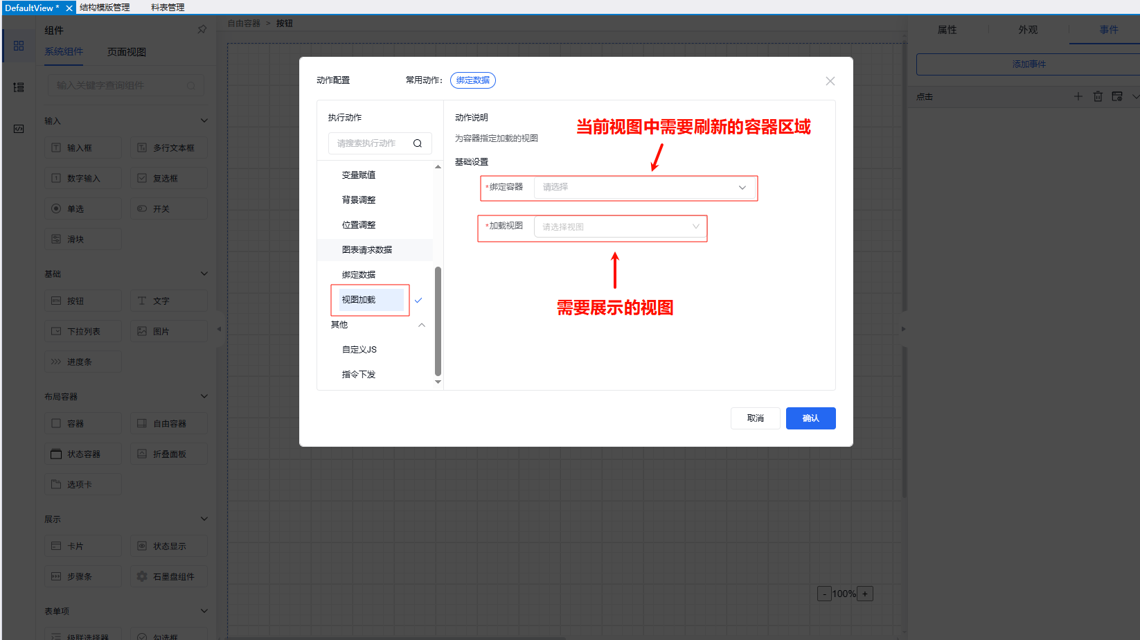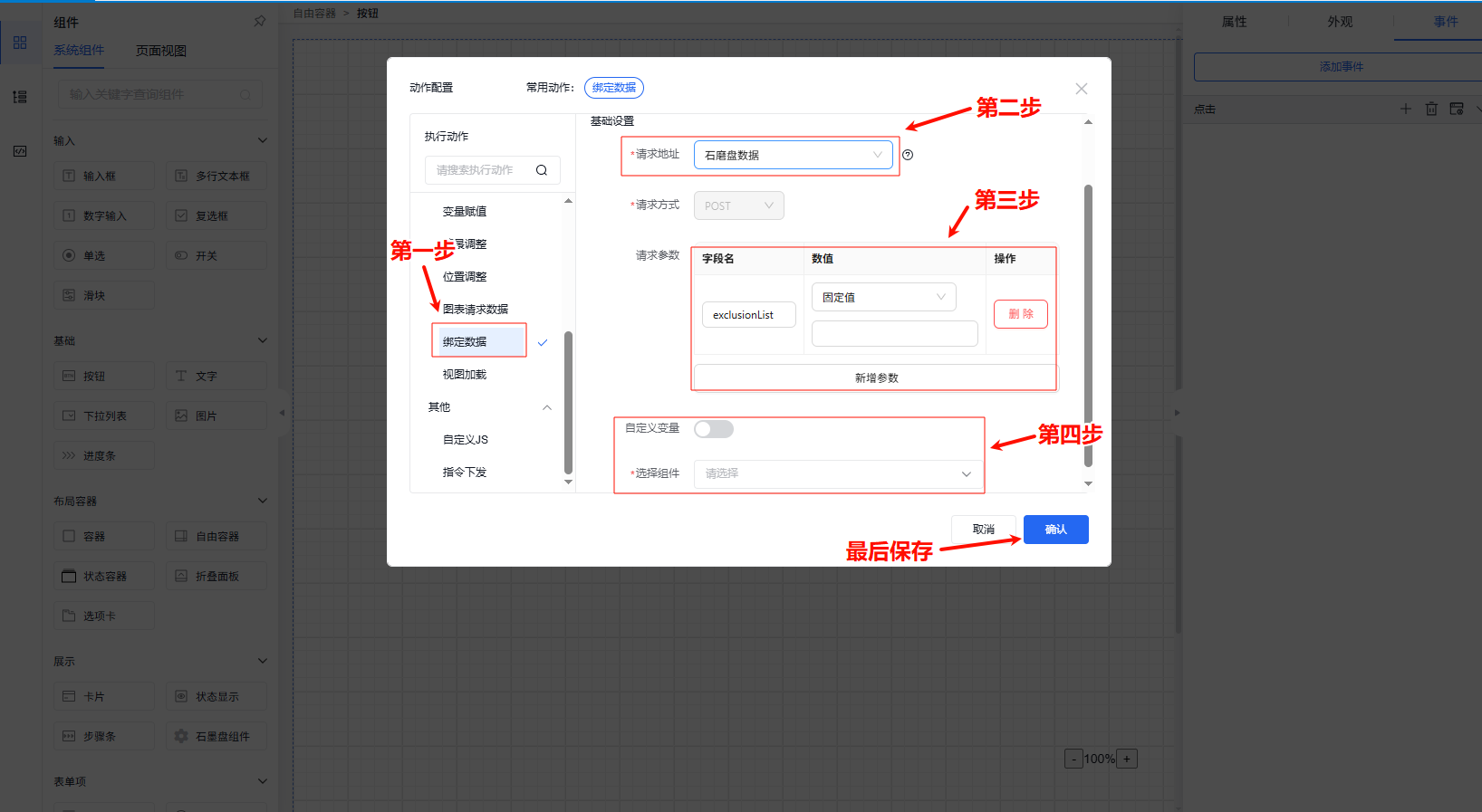 第一步进行组件事件的动作选择(如点击事件、初始化事件等),选择“绑定数据”;