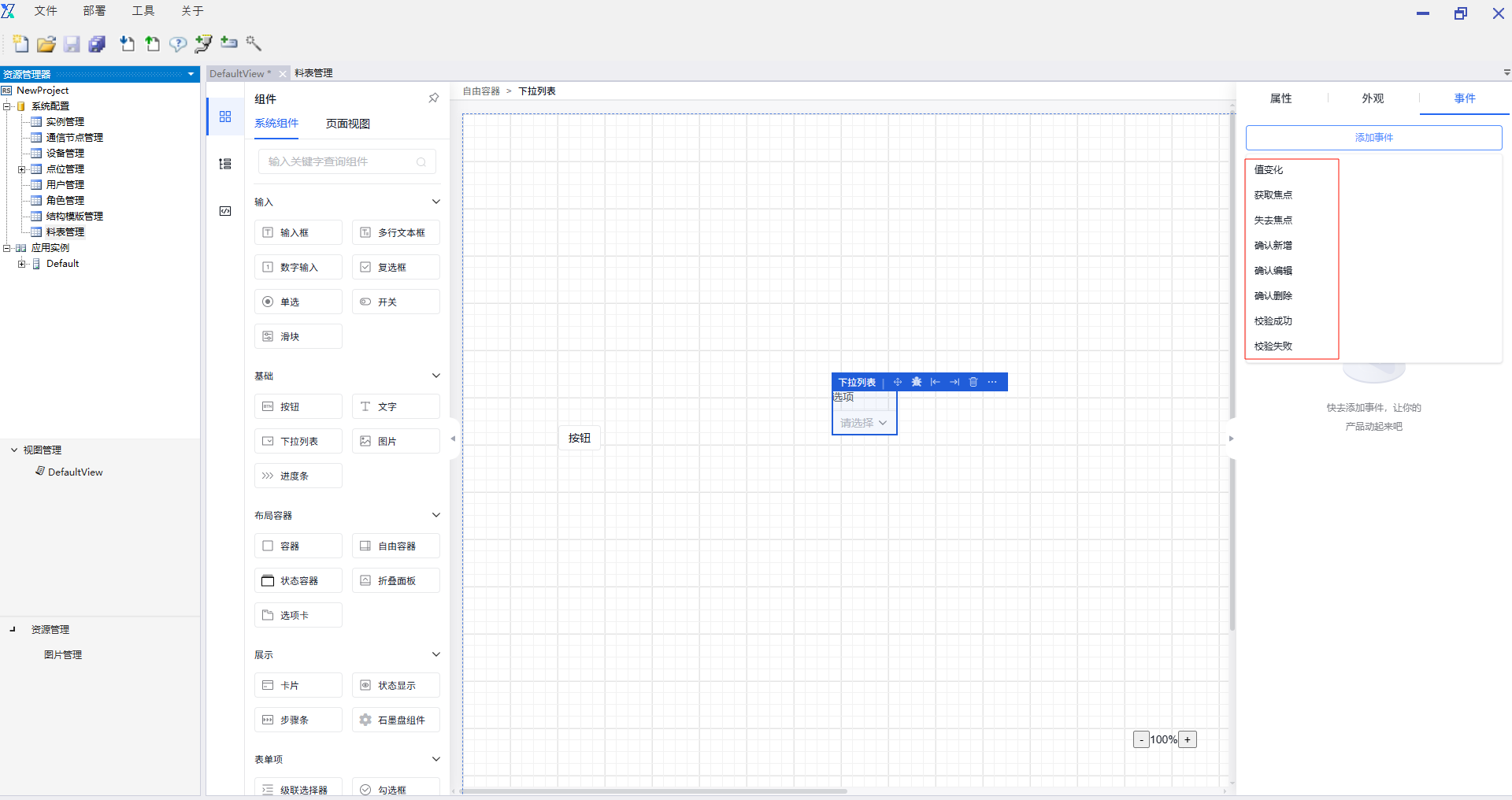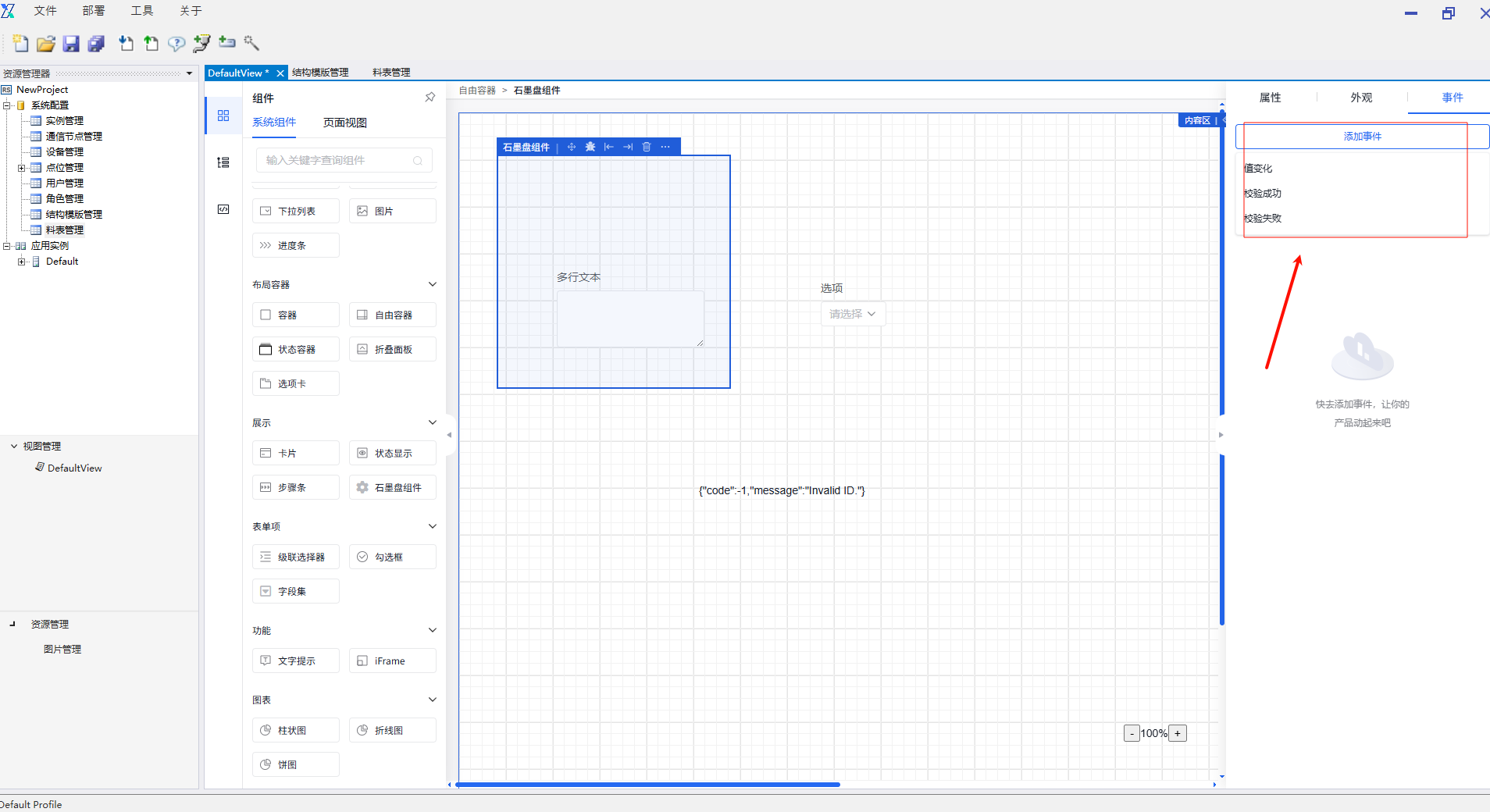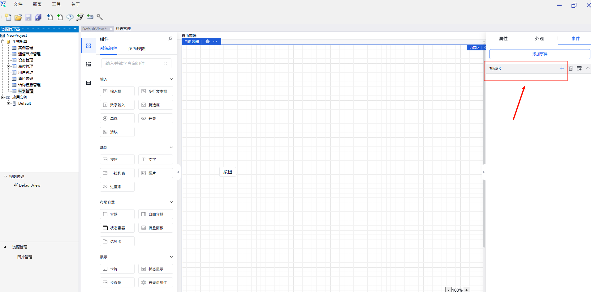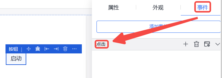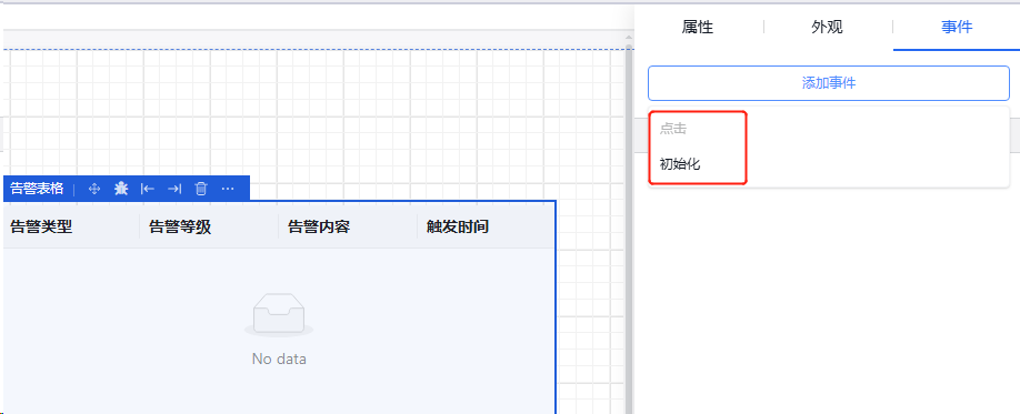 在“事件”中添加事件,告警表格事件有“点击”与“初始化”两种。