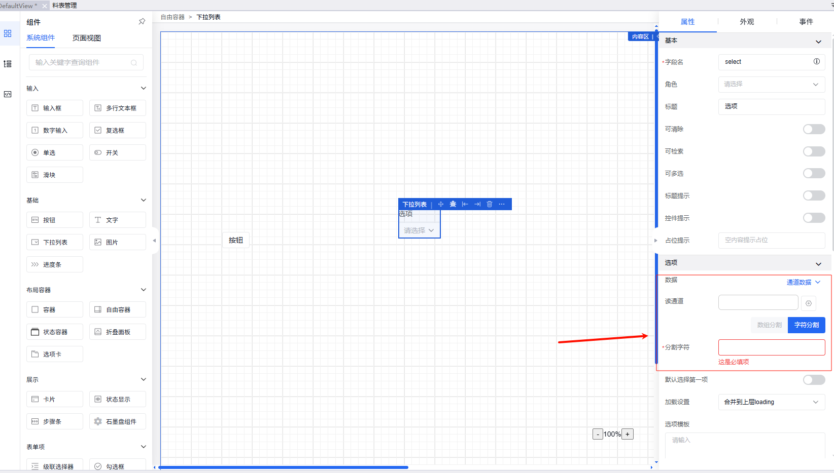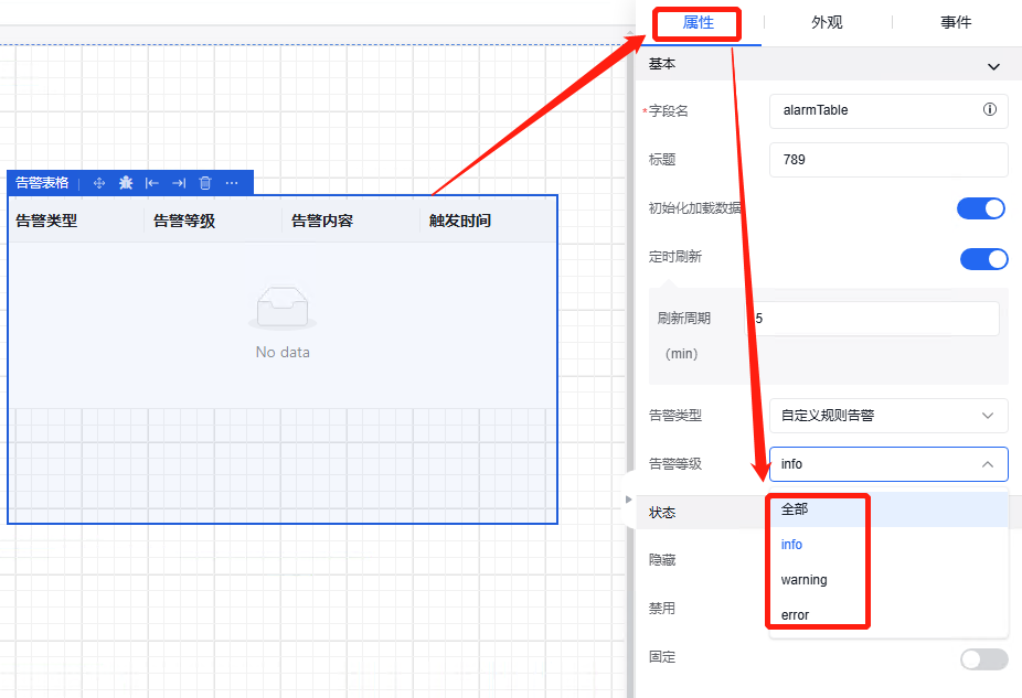 点击“告警表格”,在属性栏的“属性”部分进行修改告警等级的编辑,有“全部”、“info”、“warning”、“error”四个选项。