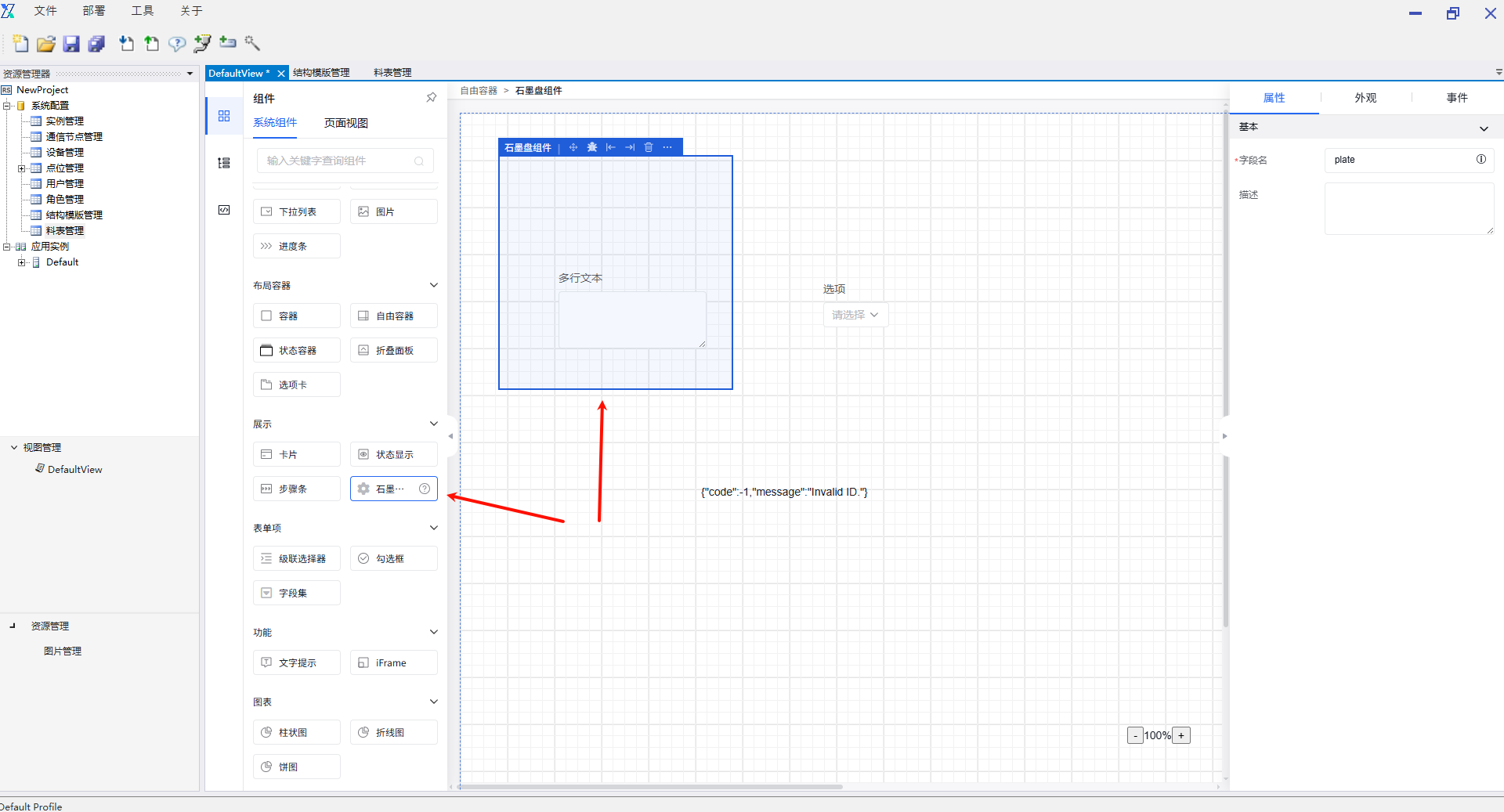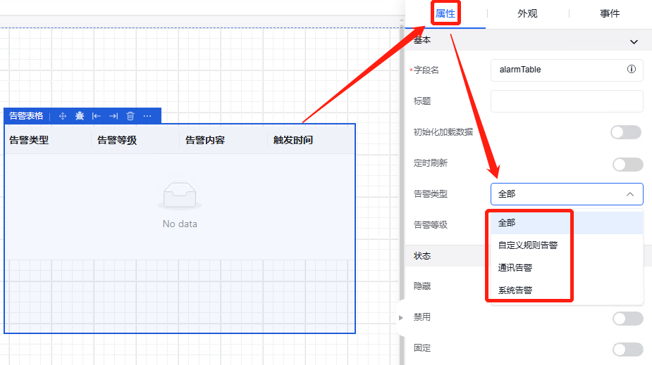 进入画布绘制页面,选中“告警表格”,组件会添加至画布中,点击“告警表格”,在属性栏的“属性”部分进行修改告警类型的编辑,有“全部”、“自定义规则告警”、“通讯告警”、“系统告警”。