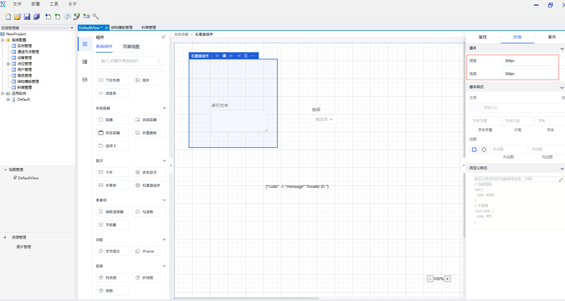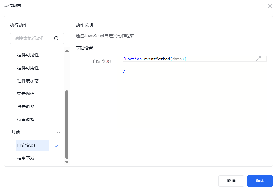 在自定义js内容里面,用户可自行编写function内容,如对指定对象进行幅值,调整某一对象样式等。但当使用值变化方法或可能造成循环嵌套触发的操作时,需关注所调用组件的变化,以免出现循环递归问题。