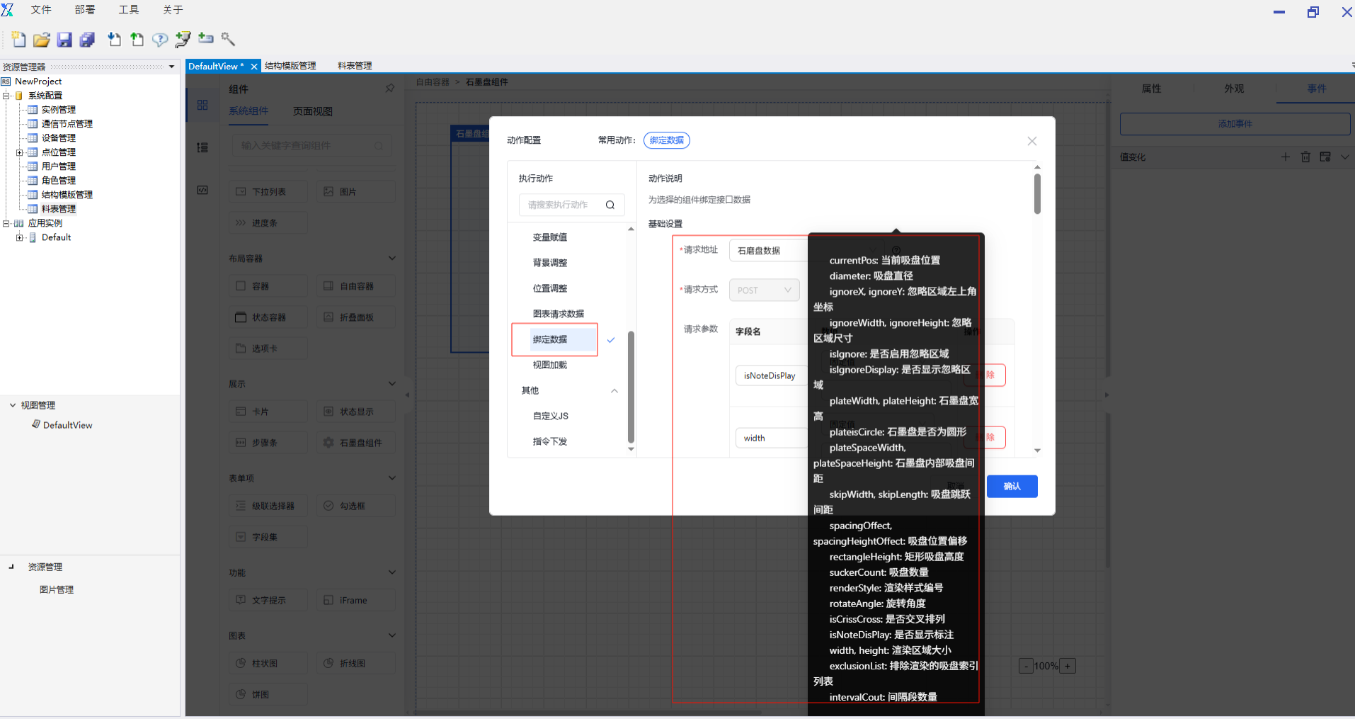 6.2.8 绑定数据 通过绑定数据组件,用户可以通过设置请求参数去请求需要的接口,把返回结果赋值给指定组件或者自定义的变量,展示在绘制的视图页面。目前系统内置了石墨盘数据、料表列表、料表详情三个服务接口,分别返回石墨盘渲染结果、料表列表数据、料表详情数据。用户也可使用自定义的接口进行结果绑定展示。