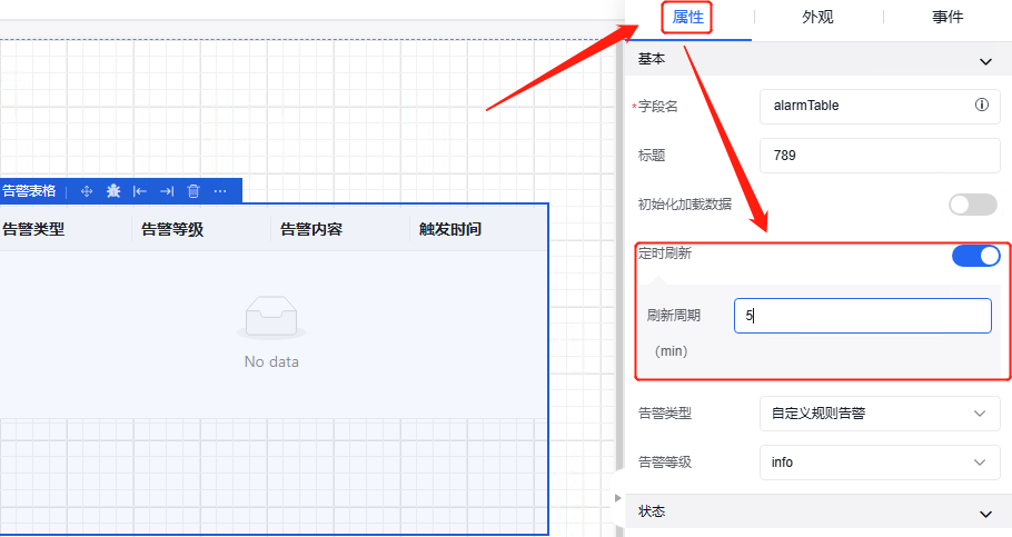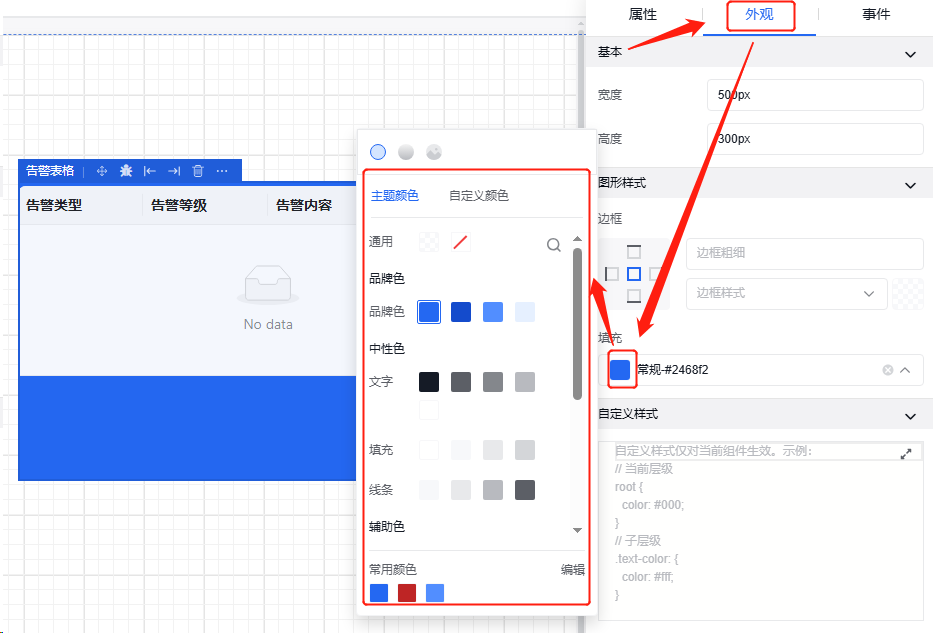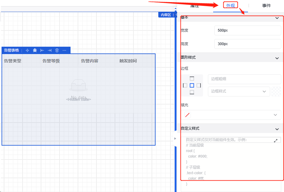 告警表格的初始化样子可通过外观属性进行设置,其中包括长、宽、边框样式、背景填充。
