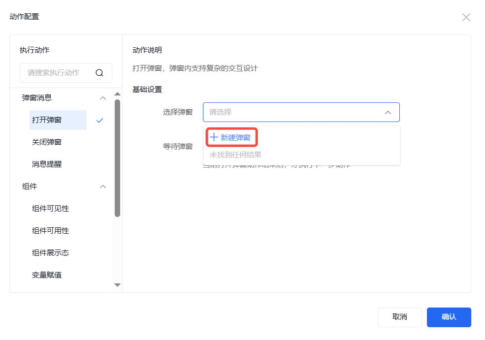 选择弹窗时,如果尚未创建弹窗,则可进行新建弹窗操作,也可选择已经创建过得该页面内的其他弹窗。弹窗新建时操作同其他组件在页面内的操作一致。