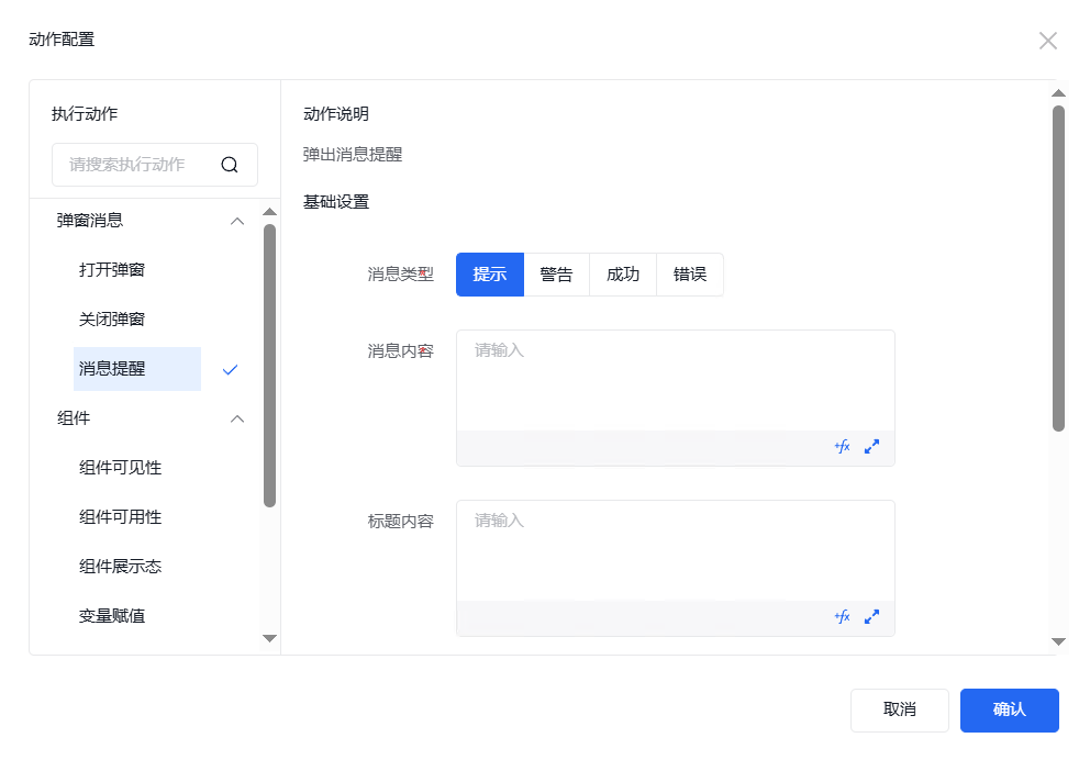 消息提醒需设置消息类型,填写消息内容。消息内容支持自定义函数填写。自定义函数填写内容详见自定义函数操作章节。同时还可设置弹出位置、持续时间等样式信息。标题内容同样支持自定义函数。