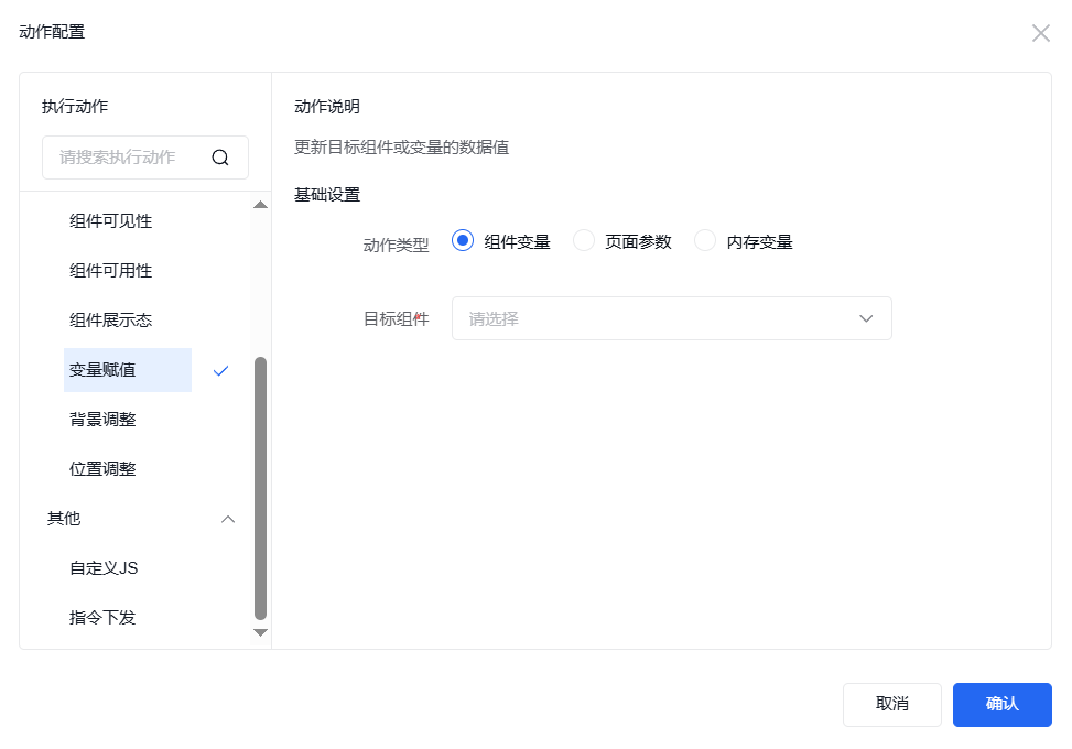 可通过组件变量、页面参数或者内存变量的动作更新目标组件或变量的数据值。