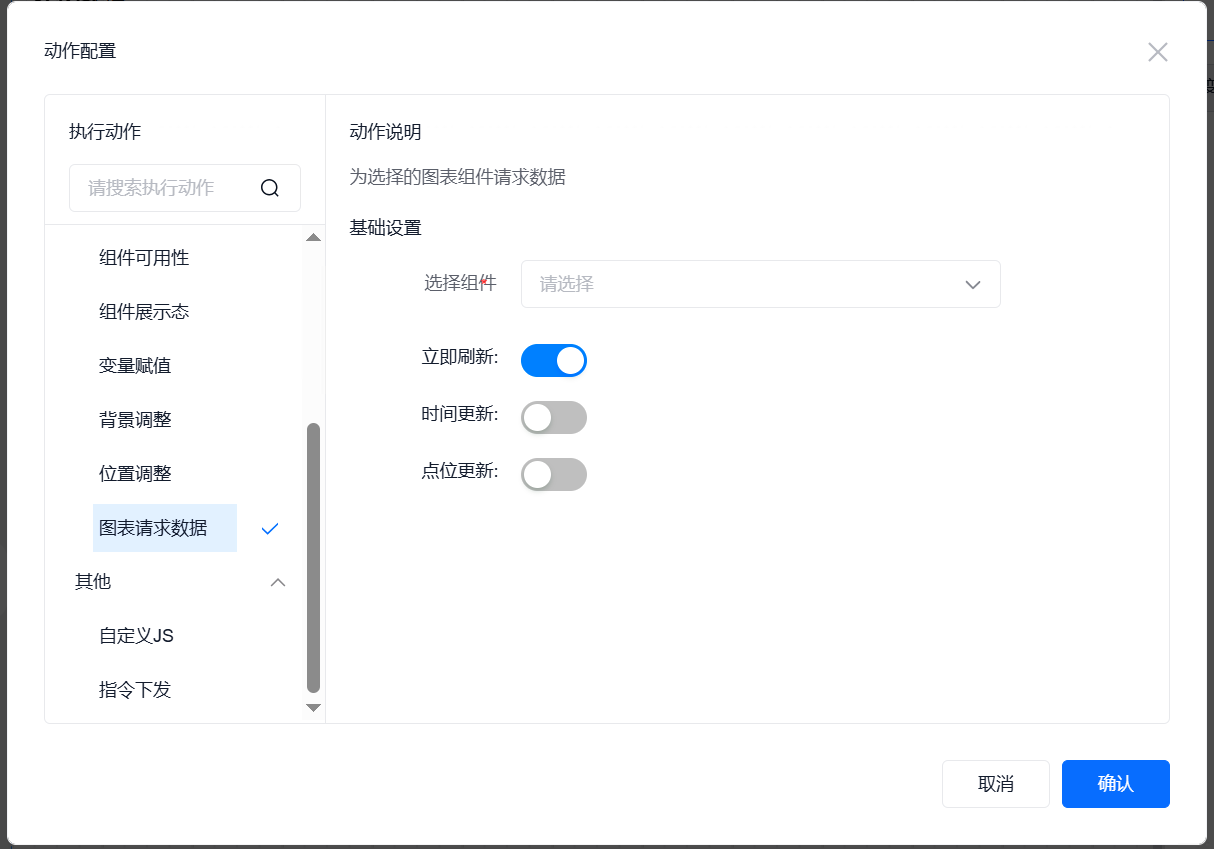 图表请求数据动作,可对当前视图中的图表组件进行数据刷新操作、图表数据时间范围重新设置、点位通道重新设定操作。