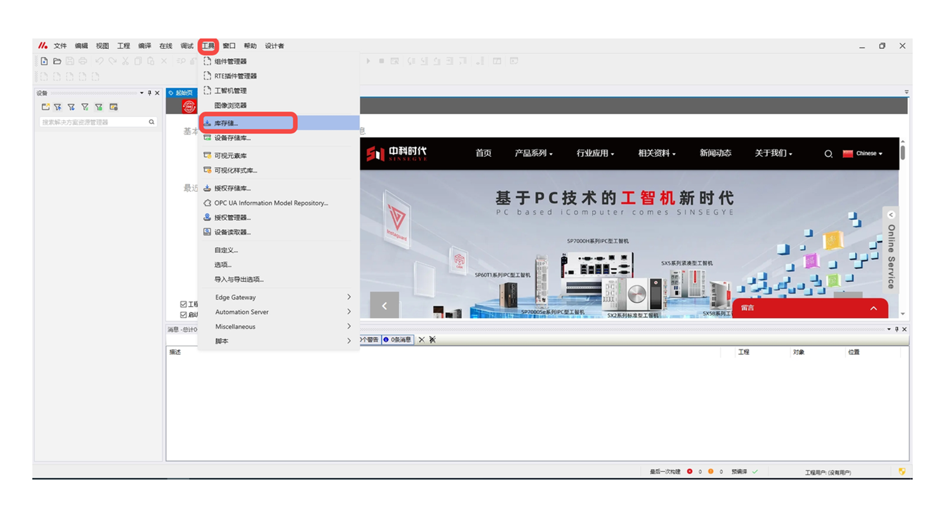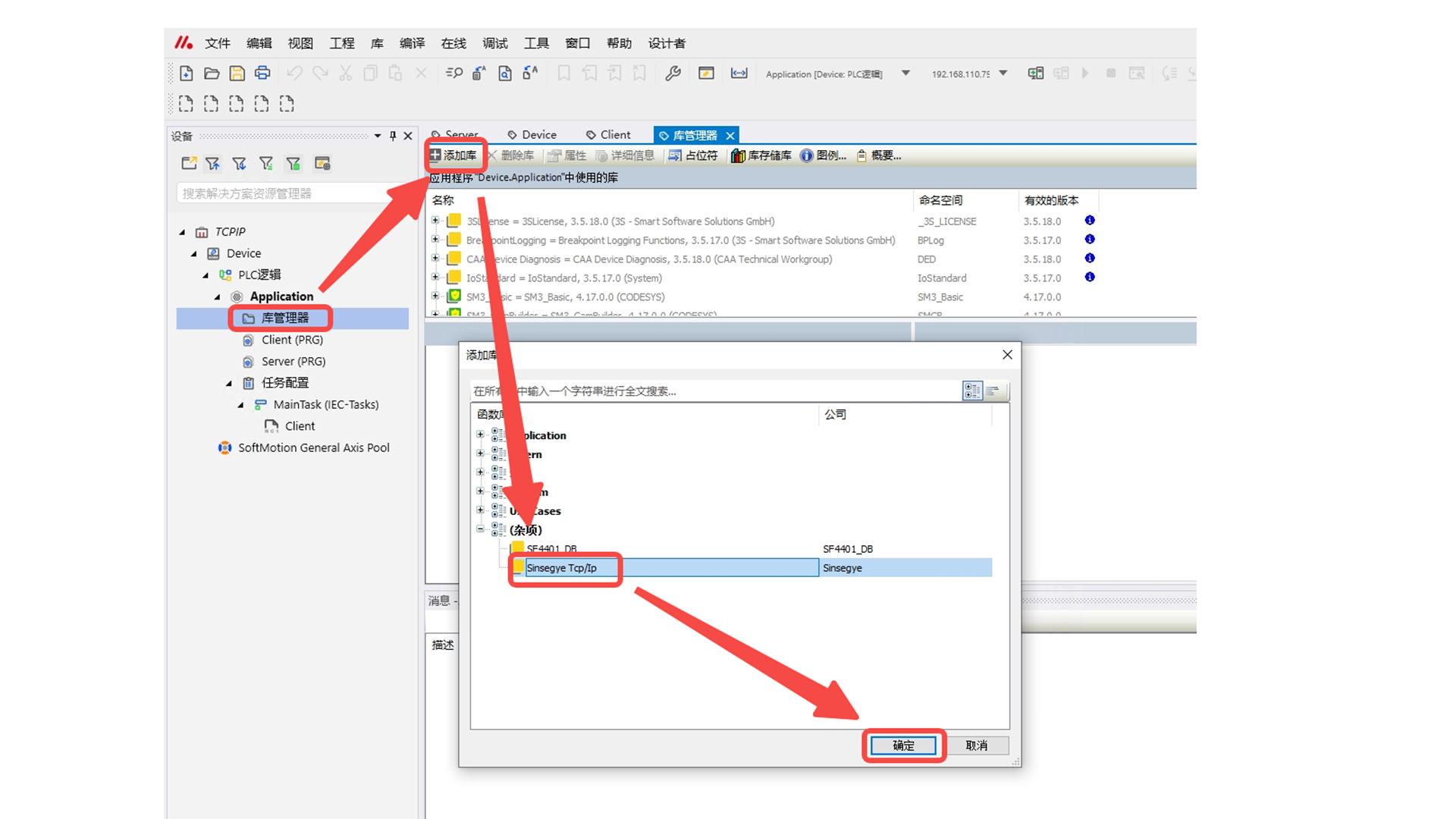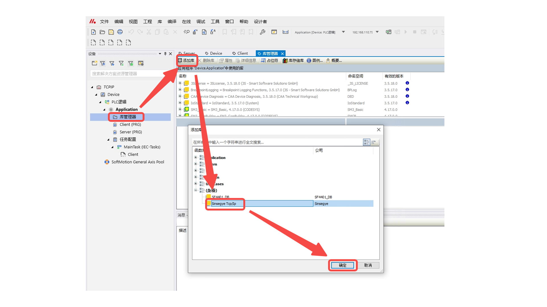 工程中双击“库管理器” -- “添加库” -- 双击“Sinsegye Tcp/Ip” ,加载库完成;