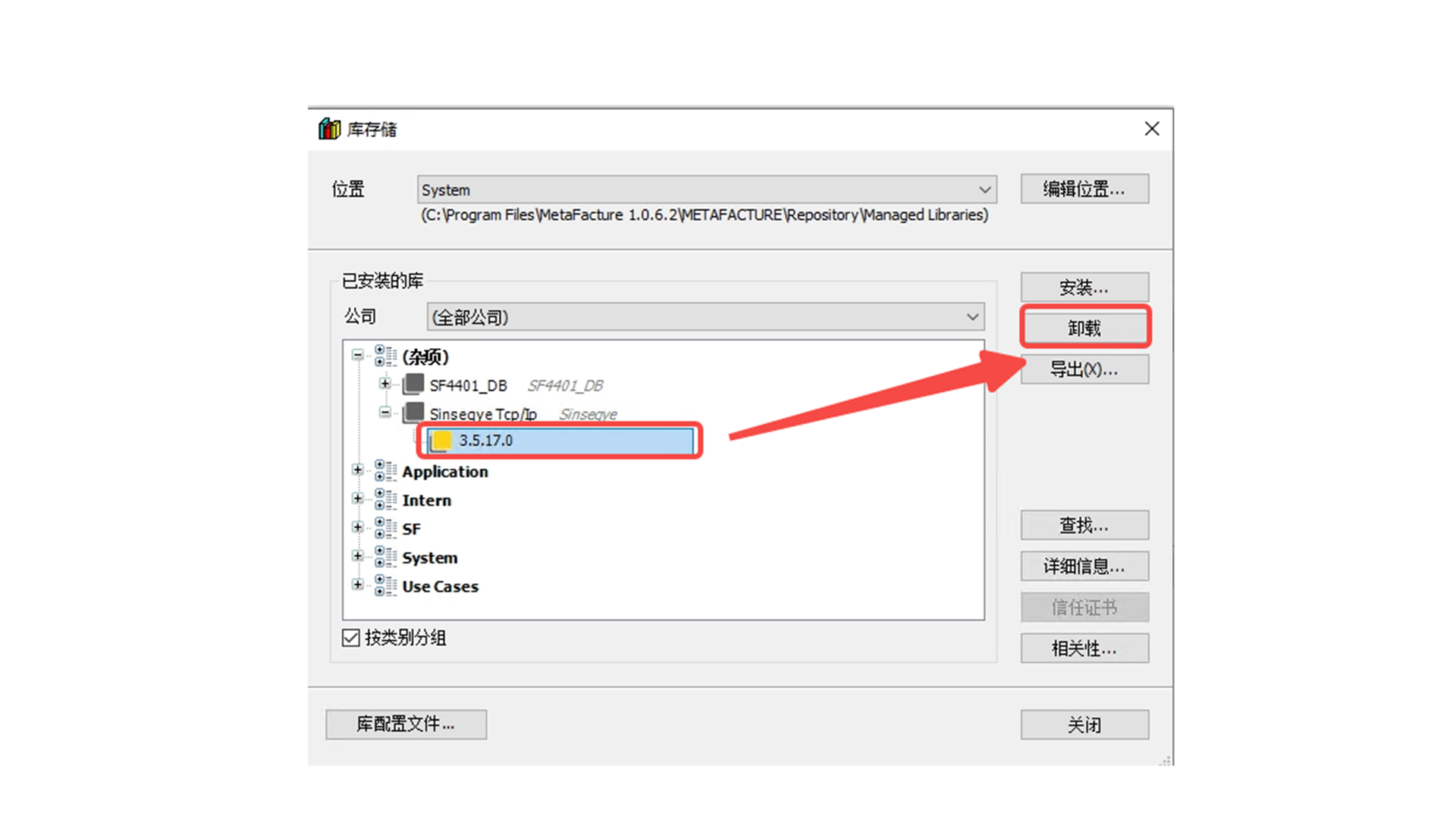 对话框中选中安装的的TCPIP库,点击“卸载”